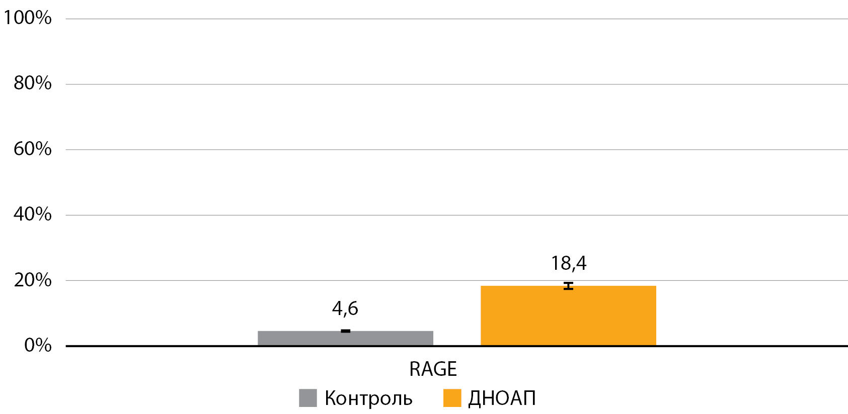 Мы зафиксировали значимое повышение экспрессии RAGE в костях стопы у пациентов с ДНОАП по сравнению с группой контроля. У этих же лиц было обнаружено и более высокое содержание AGE в крови по сравнению с группой без данного осложнения. Однако при статистическом анализе их к общему числу пациентов статистически значимых различий по уровню AGE в крови обнаружено не было.