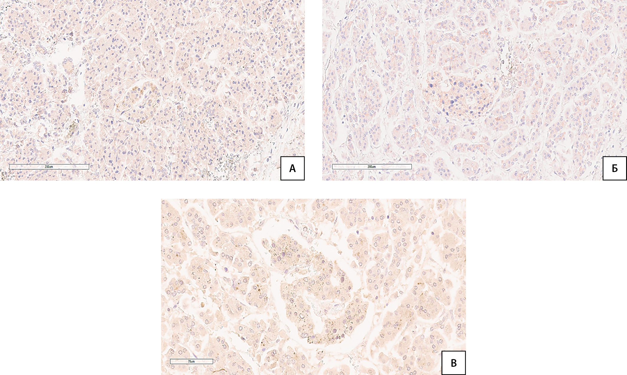 3. Рисунок 3. А) Цитоплазматическое окрашивание клеток эндокринной части поджелудочной железы SARS-CoV-2 spike protein; Б) цитоплазматическое мелкогранулярное окрашивание эндокринной части поджелудочной железы ACE2; В) цитоплазматическое мелкогранулярное окрашивание эндокринной части поджелудочной железы DPP4