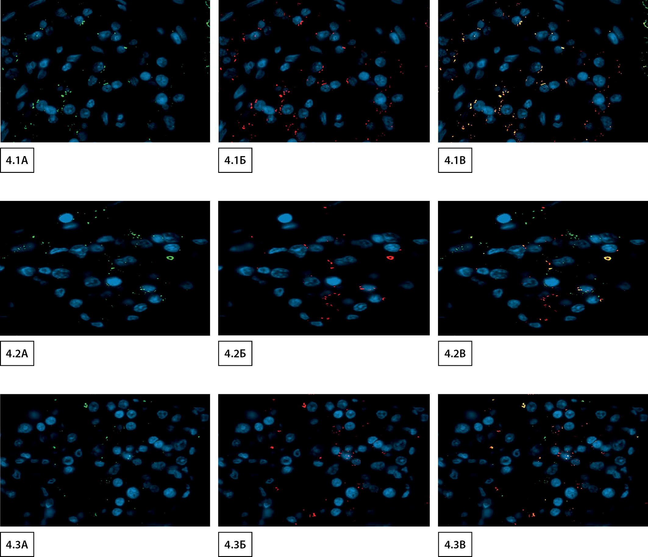 4. Рисунок 4. Флуоресцентная микроскопия с двойной меткой, увеличение х680: 4.1 Экспрессия SARS-CoV-2 spike protein в эндокринной части поджелудочной железы: А) зеленый сигнал — распределение антитела SARS-CoV-2 spike protein; Б) красный сигнал — распределение антитела к инсулину; В) желтый сигнал — ко-локализация SARS-CoV-2 и инсулина. 4.2. Экспрессия DPP4 в эндокринной части поджелудочной железы: А) зеленый сигнал — распределение антитела ACE2; Б) красный сигнал — распределение антитела к инсулину; В) желтый сигнал — ко-локализация ACE2 и инсулина. 4.3. Экспрессия SARS-CoV-2 spike protein, DPP4 и ACE2 в эндокринной части поджелудочной железы: А) зеленый сигнал — распределение антитела DPP4; Б) красный сигнал — распределение антитела к инсулину; В) желтый сигнал — ко-локализация DPP4 и инсулина.
