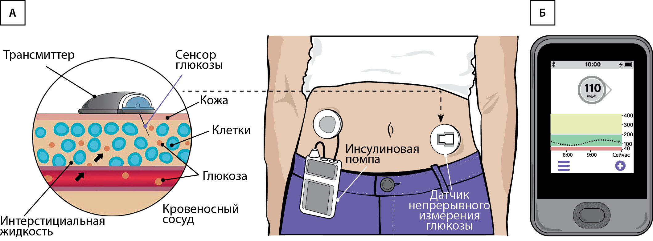 состоит из передатчика (трансмиттера), датчика (сенсора) глюкозы (А)
