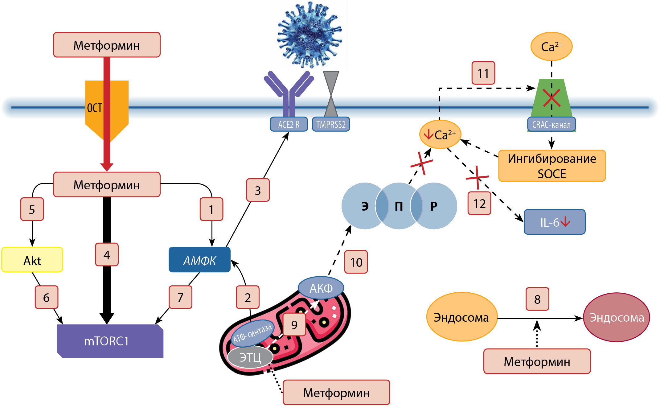 В соответствии с вышеизложенным, к 2023 г. накоплено большое количество научных данных в пользу эффективности метформина против SARS-COV-2 и других инфекционных агентов. Для понимания противовирусного эффекта метформина рассмотрим механизм проникновения и размножения вируса в клетках хозяина. SARS-COV-2 связывается с помощью белка шипа [S] с ангиотензинпревращающим ферментом 2 (AПФ2) клеток человека, в результате чего происходит рецептор-зависимый эндоцитоз. Процесс репликации вируса напрямую зависит от вновь синтезированных фосфолипидов и реконструированных мембранных везикул клеток хозяина. Для этого SARS-CoV-2 повышает сигнальную активность PI3K/AKT/mTOR/S6K, что увеличивает выработку липидных анаболических ферментов: синтазу жирных кислот и ацетил-КоА-карбоксилазу. Впоследствии повышается синтез пальмитата, который используется для пальмитоилирования белков и дальнейшего превращения в более сложные липиды, использующиеся для построения вирусных оболочек и органелл репликации; собранные вирионы высвобождаются путем экзоцитоза. Связывание SARS-CoV-2 с АПФ2 и снижение его доступности для лиганда создает дисбаланс в ренин-ангиотензин-альдостероновой системе (РААС), приводя к гиперактивации оси AngII/AT1R и запуску воспалительного процесса, опосредованного активацией NF-κB. В результате увеличивается синтез и секреция провоспалительных цитокинов: фактора некроза опухоли-альфа (TNFα), интерлейкина-6 (IL-6), интерлейкина-1 (IL-1), интерлейкина-1 бета (IL-1β) [4][55].