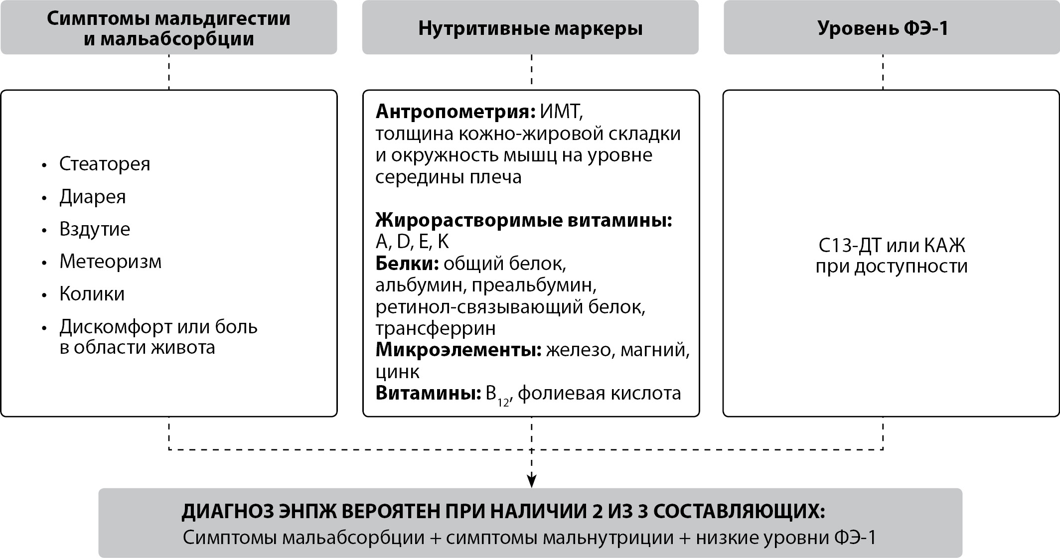 Диагноз ЭНПЖ может быть установлен при наличии двух из трех составляющих: симптомы мальдигестии и мальабсорбции, снижение уровня нутритивных маркеров, снижение экзокринной функции ПЖ по результатам теста на фекальную эластазу 1 (ФЭ-1) или коэффициента абсорбции жиров (КАЖ) (рис. 1) [15][16].