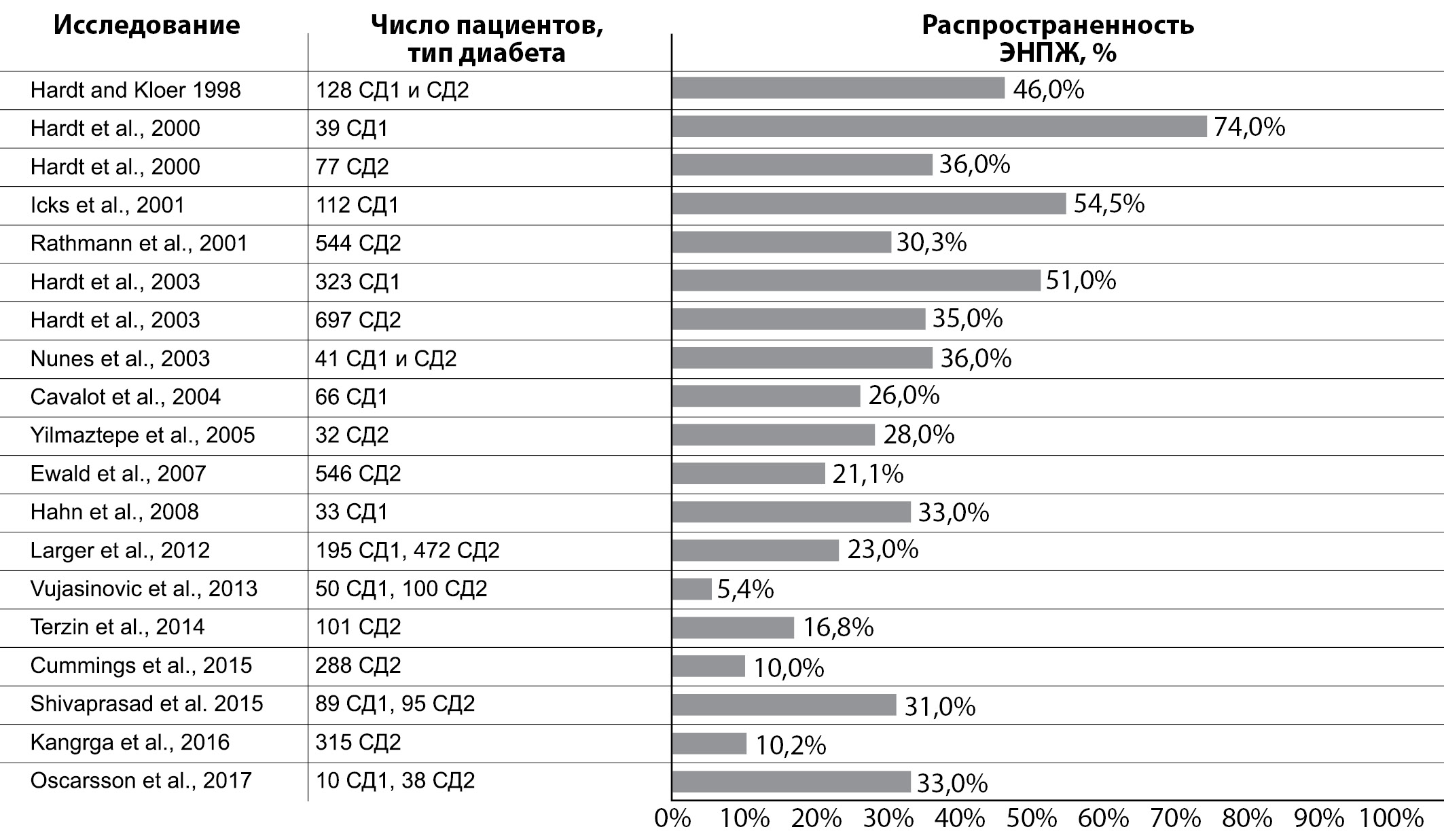 ЭНПЖ может встречаться при многих заболеваниях и состояниях, в том числе и при СД1 и СД2, когда распространенность доходит до 50% [27].