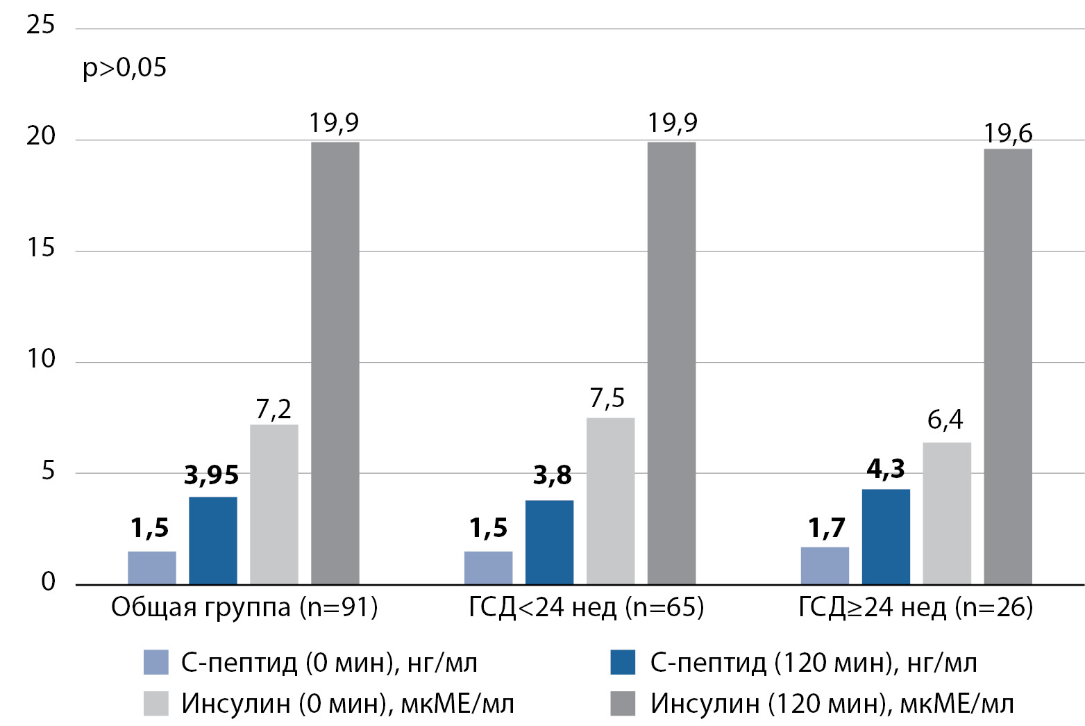 Исходя из таких предположений, в основу настоящего исследования положен поиск возможной связи между снижением инсулинпродуцирующей функции β-клеток ПЖЖ у беременных и нарушением продукции инкретинов как одних из важных стимулирующих агентов островковых клеток [23]. Однако полученные в работе уровни инсулина и C-пептида в анализируемой выборке соответствовали физиологическим концентрациям и демонстрировали удовлетворительный постпрандиальный прирост в ходе теста. Ожидаемой гиперинсулинемии и выраженной ИР в исследуемых группах не выявлено, что может объясняться изменением характеристики беременных с данным диагнозом в целом и частым выявлением заболевания на ранних сроках гестации. При сравнительном анализе показателей прироста в группах с разным сроком развития ГСД статистически значимой разницы не получено ни по динамике инсулина (р=0,9), ни по динамике C-пептида (р=0,4). Таким образом, установленные результаты не позволяют утверждать, что есть взаимосвязь срока развития ГСД с особенностями состояния β-клеток ПЖЖ, более того, в целом не подтверждают значимый вклад ИР в развитие заболевания в данной группе.
