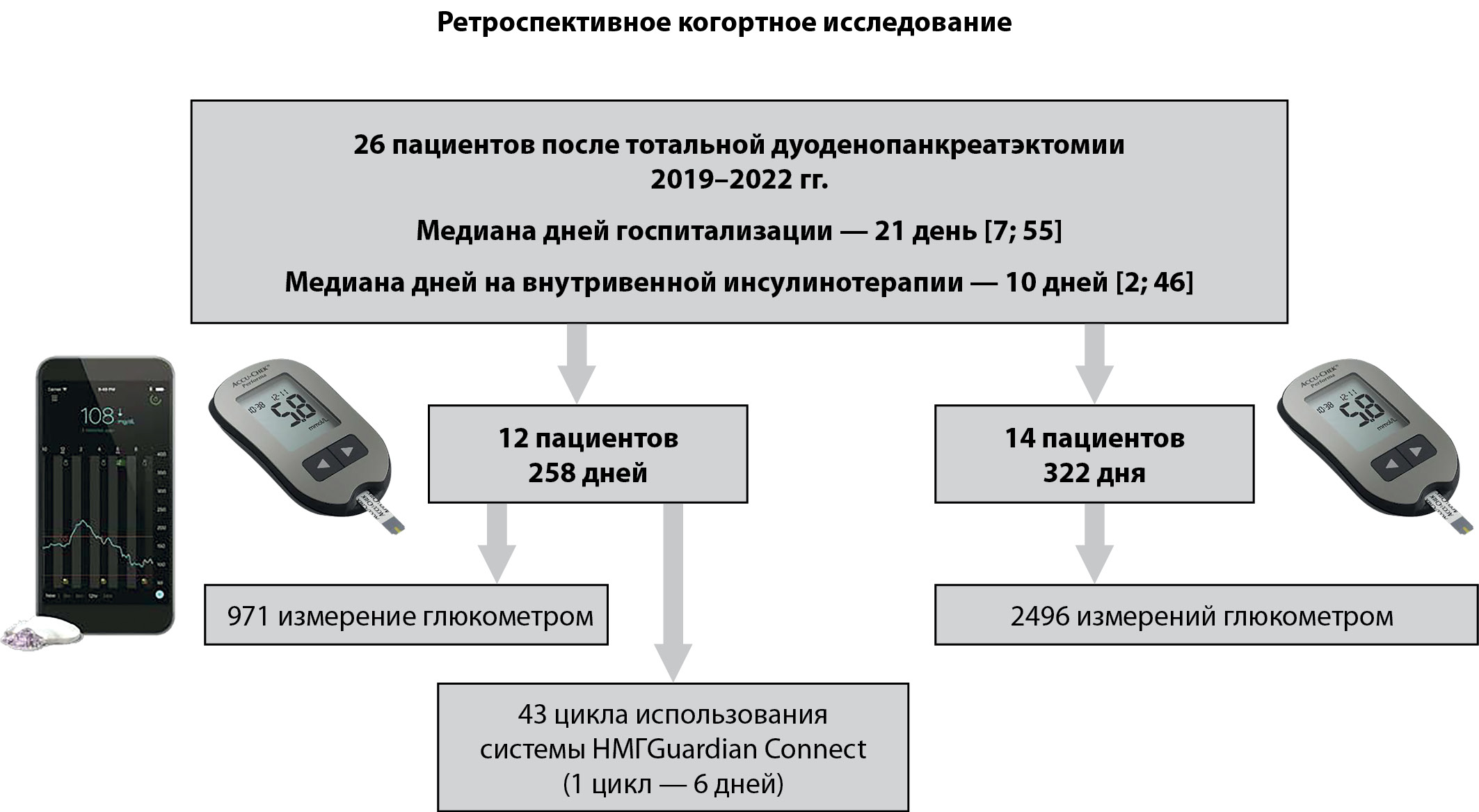 ЦЕЛЬ. Оценить безопасность и экономическую эффективность использования системы непрерывного мониторирования гликемии (НМГ) Guardian Connect в раннем послеоперационном периоде у пациентов после тотальной дуоденопанкреатэктомии (ТДПЭ) на этапе внутривенной инсулинотерапии.
