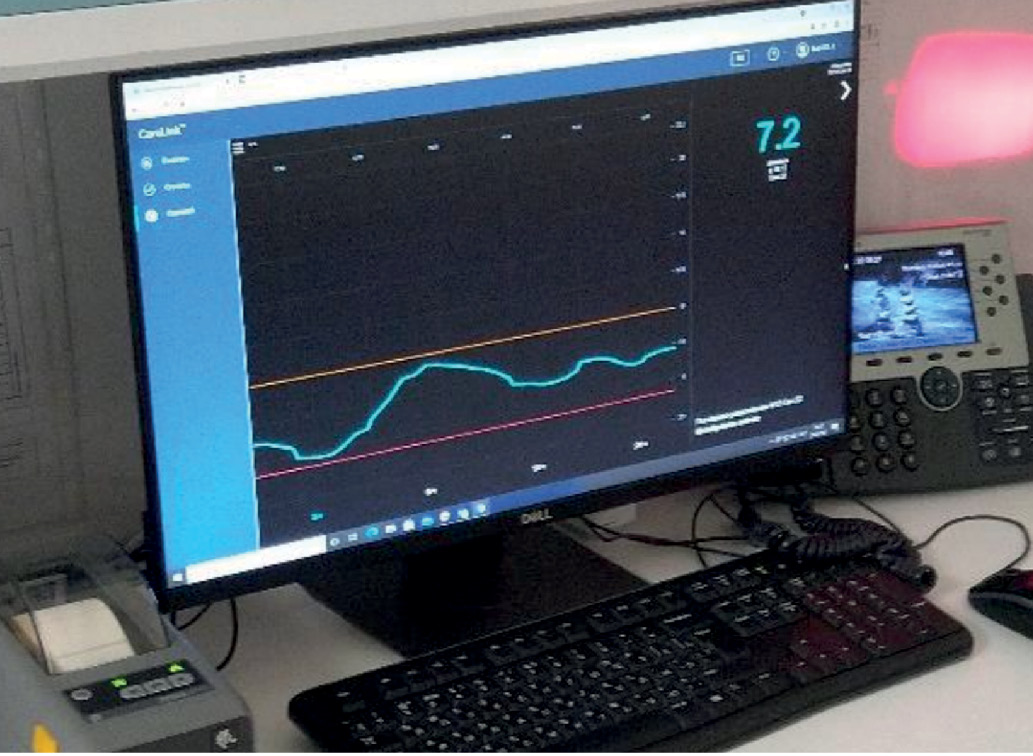 Сенсор глюкозы Enlite (Medtronic International Trading Sarl.) устанавливался подкожно в область плеча или живота. После установки сенсор в течение 5 минут подключался к системе Guardian Connect с помощью смартфона с необходимым программным обеспечением (рис. 2). После нескольких часов периода инициализации средний медицинский персонал проводил измерение гликемии с помощью глюкометра и вводил показания в систему НМГ для первой калибровки. После первоначальной калибровки устройство калибровали каждые 8 часов в течение всего периода работы сенсора. Смартфон располагался у постели пациента и получал от сенсора данные каждые 5 минут. Все полученные данные синхронизировались с компьютером на посту среднего медицинского персонала через систему Carelink (Medtronic International Trading Sarl.) в режиме реального времени (рис. 3). Средний медицинский персонал регистрировал в электронной медицинской карте значения глюкозы по НМГ параллельно с измерением глюкометром у койки пациента каждый раз, когда измерение глюкометром было завершено.
