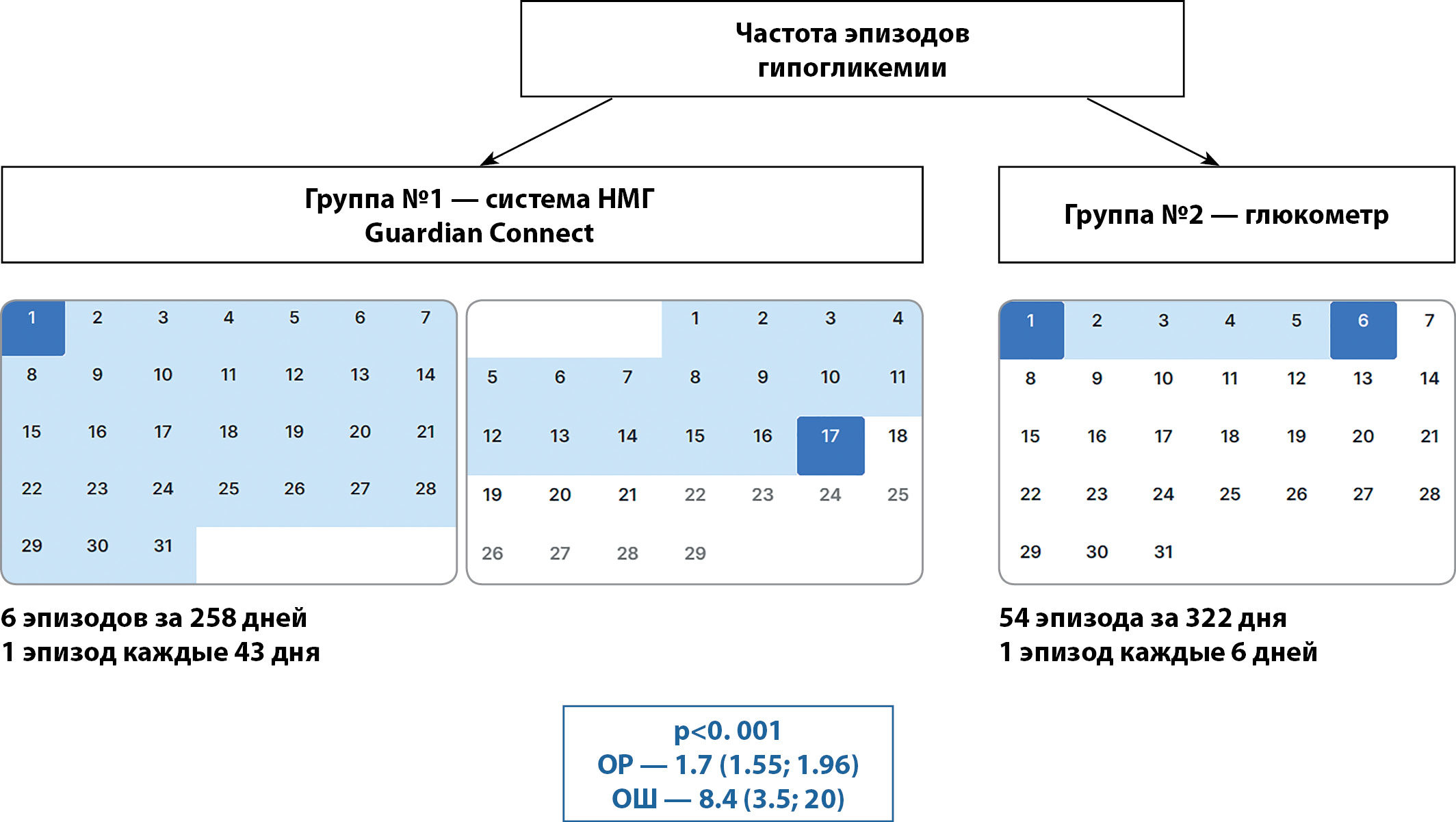 Количество эпизодов гипогликемии (<3,9 ммоль/л) было статистически значимо ниже в группе НМГ (6 vs 54, р<0,001, ОШ 8,463 [3,579; 20,015], ОР 1,746 [1,551; 1,966]).