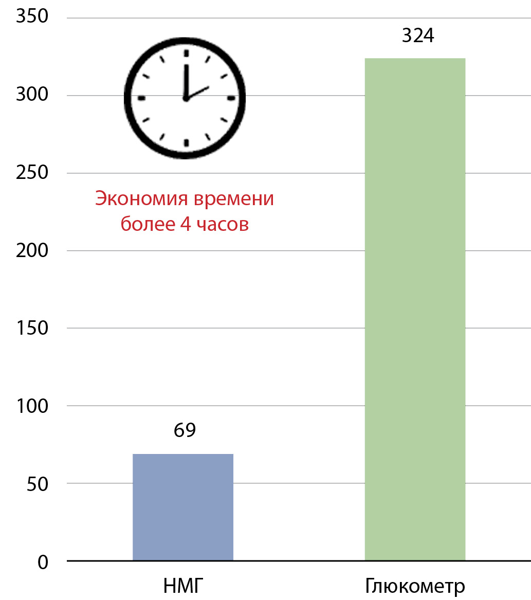 Использование системы НМГ Guardian Connect в обсуждаемой группе больных может дать экономию в 255 минут (4 часа 15 минут) рабочего времени среднего медицинского персонала за 6 дней, а также способствовать сокращению затрат клиники на проведение контроля уровня глюкозы. В нашем случае это составило экономию более чем на 21% за аналогичный период (6 дней).