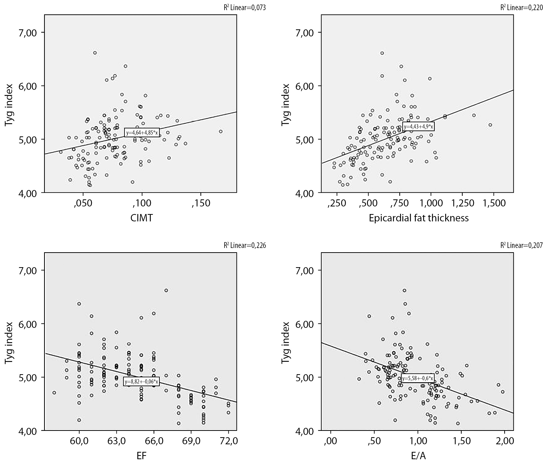 1. Figure 1: Correlation of Tyg index with carotis intima media thickness, epicardial fat thickness, E/A ratio and ejection fraction.