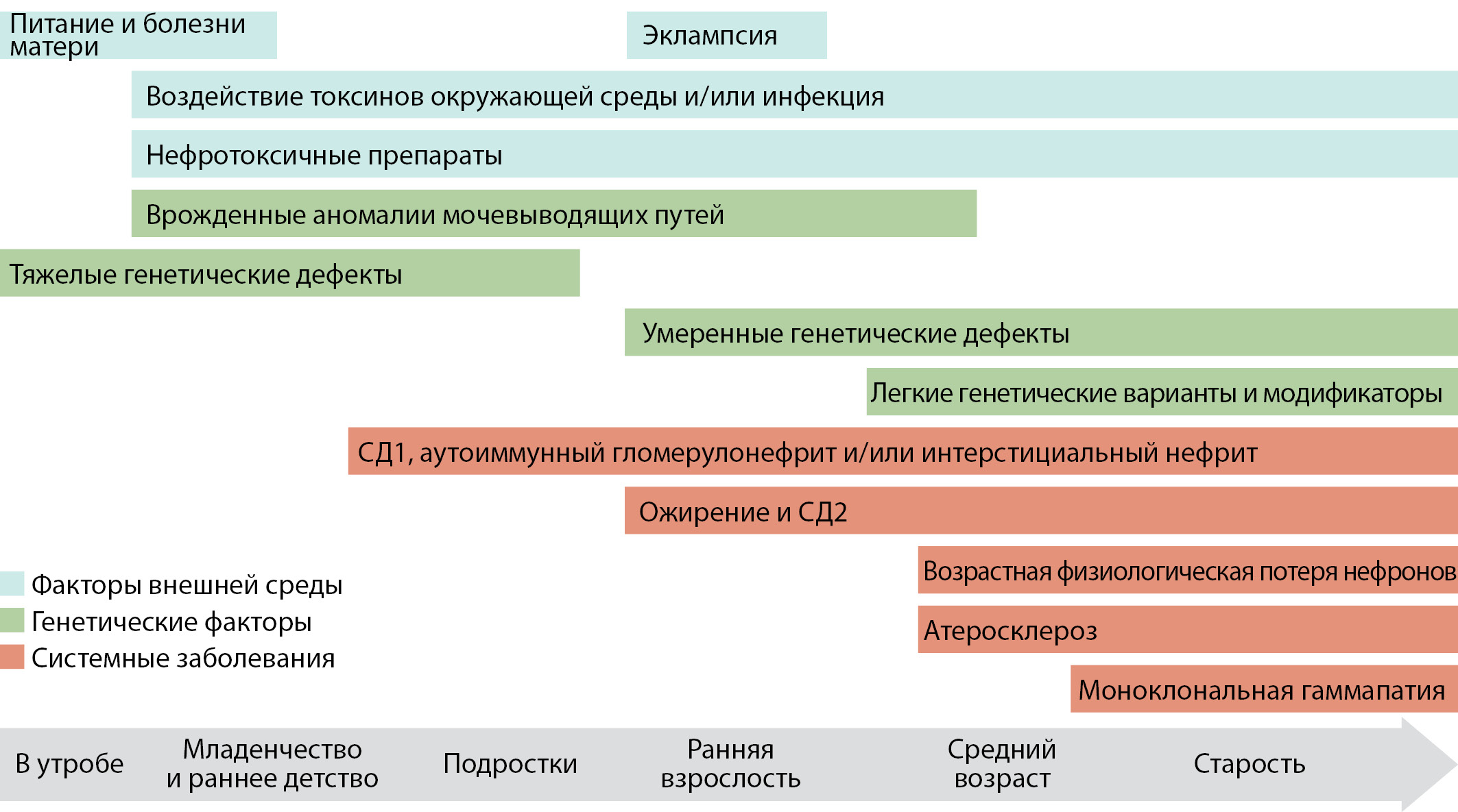 Хроническая болезнь почек (ХБП) (наднозологический термин) определяется как нарушение в течение 3 мес и более структуры и/или функции почек вследствие действия различных этиологических факторов [1]. ХБП представляет собой многофакторную патологию, развивающуюся вследствие совокупности влияния внешних средовых и генетических причин, вызывающих снижение массы нефронов и их функции. Сочетание этих факторов на разных этапах жизни и определяет индивидуальный риск развития ХБП в определенные периоды времени (рис. 1) [2].