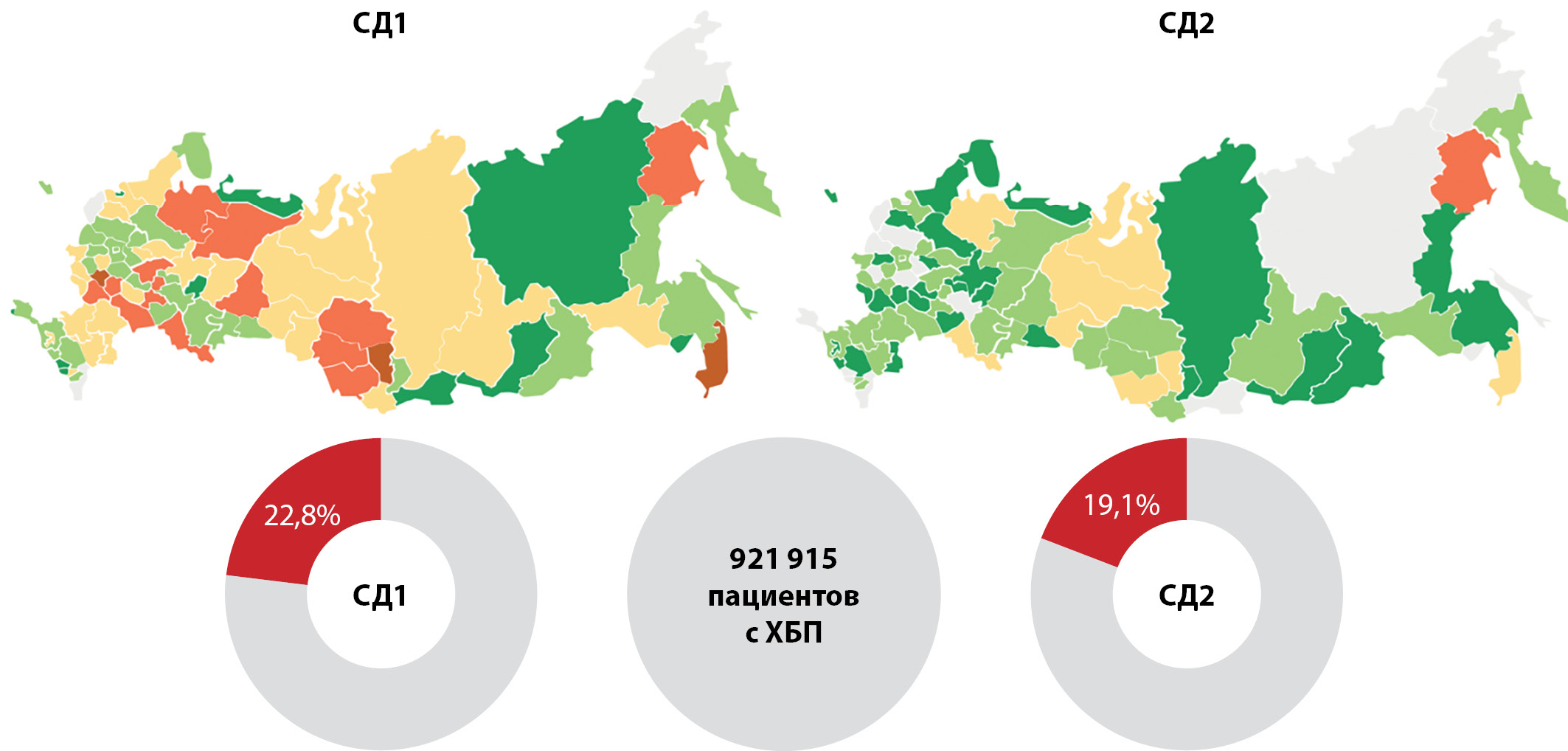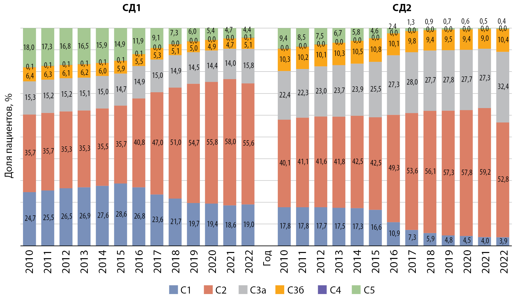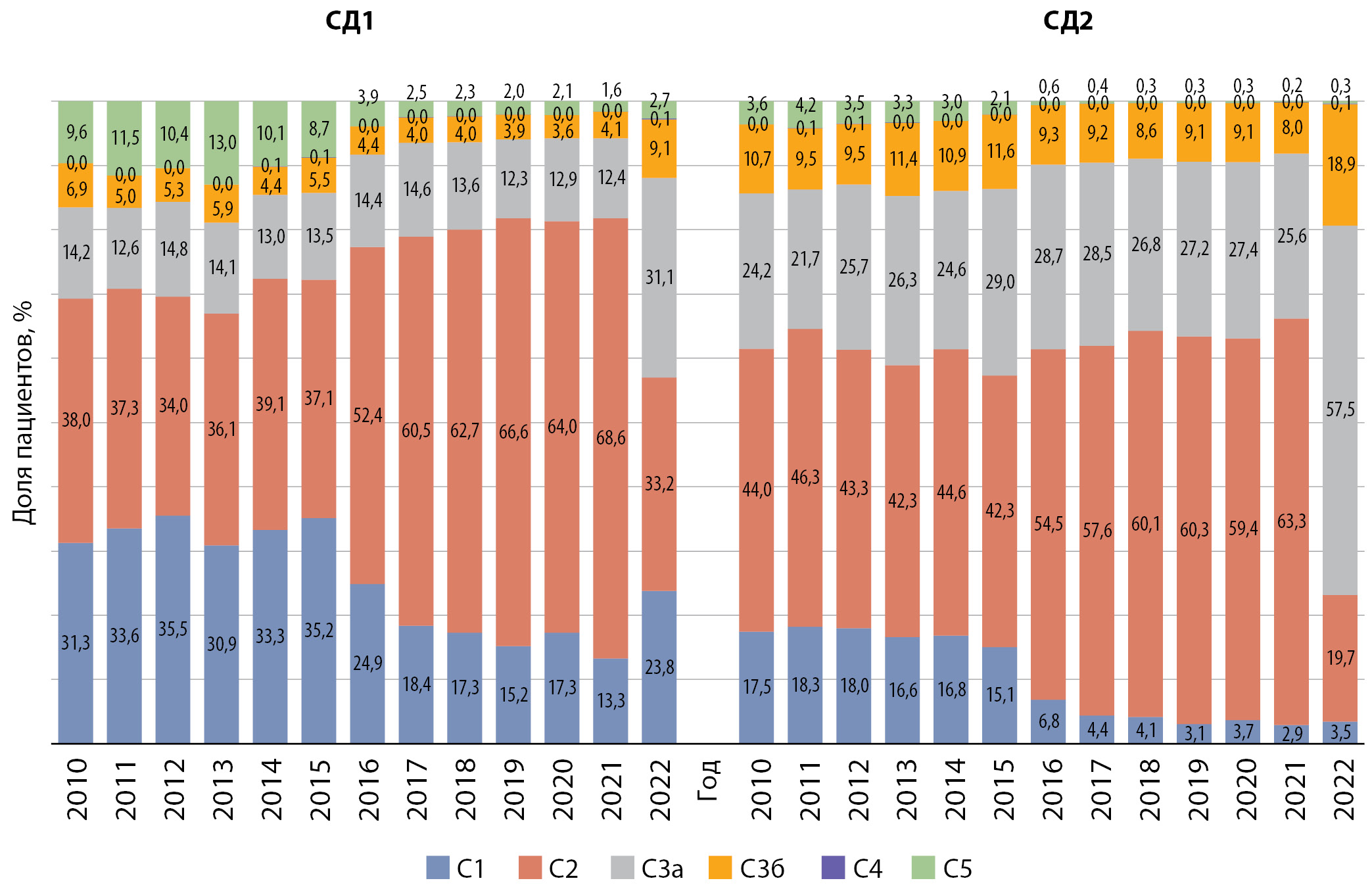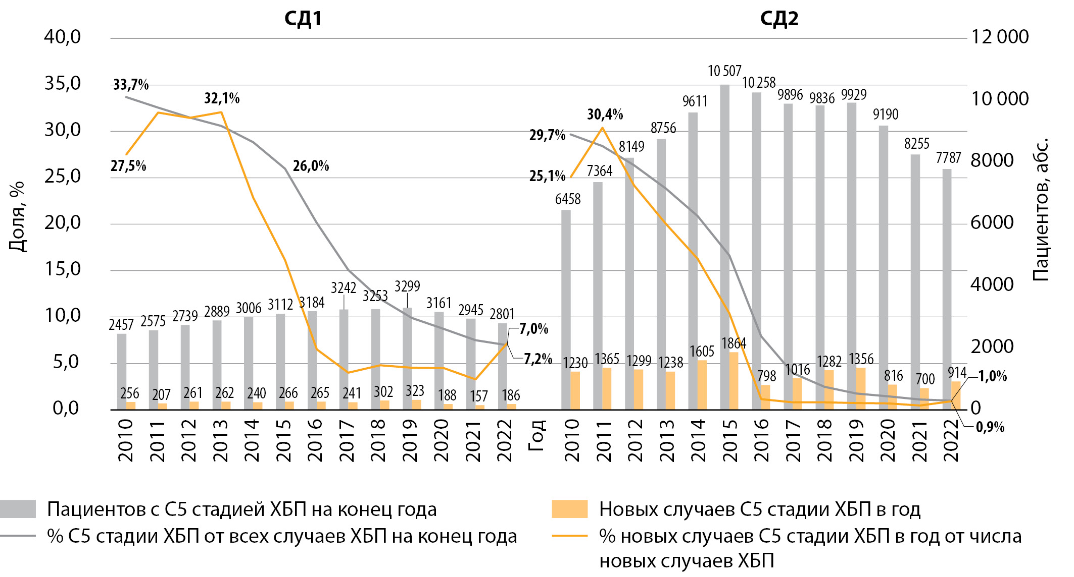 С этих позиций документирование ежегодного прироста пациентов с СД2 и ХБП следует рассматривать как позитивный результат работы врачей в регионах. Заслуживает внимания факт увеличения в 2022 г. численности пациентов с СД1, и особенно с СД2 на стадии С3, с предположением о роли пандемии COVID-19, приведшей к обращению вспять некоторых ранее наработанных положительных тенденций. Об этом же на фоне последовательного улучшения показателей заболеваемости, госпитализации и смертности пациентов с ХБП в США за предыдущее десятилетие сообщает ежегодный отчет USRDS [4].