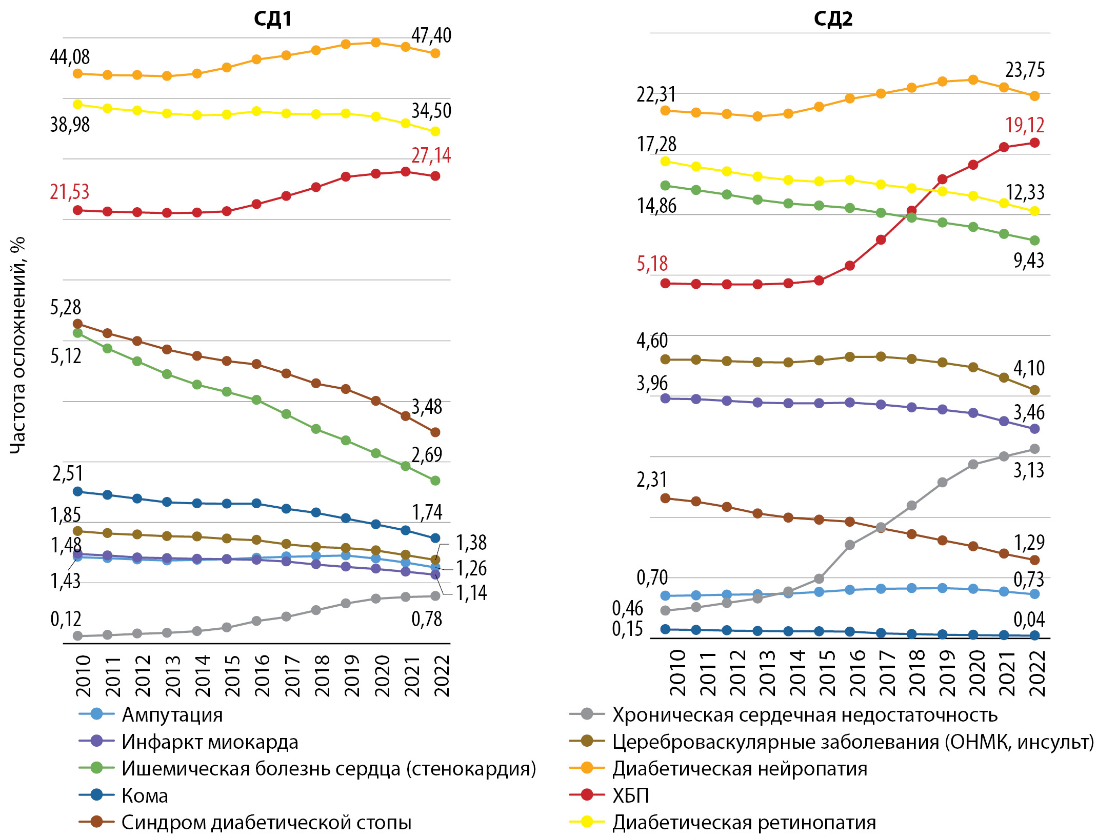3. Рисунок 3. Динамика частоты осложнений при сахарном диабете 1 и 2 типа в Российской Федерации, 2010–2022 гг., у взрослых пациентов (старше 18 лет) [11]. | |
