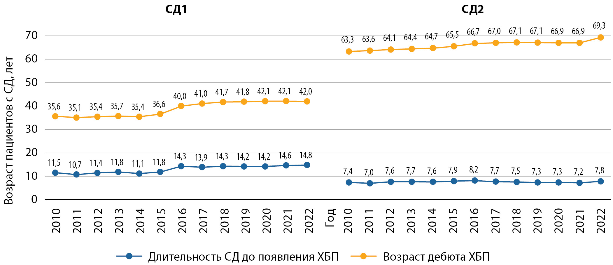 Возрастные характеристики ХБП (длительность СД до развития патологии и возраст дебюта осложнения), по данным ФРСД, продолжают свидетельствовать о стабильном увеличении данных показателей при обоих типах СД, даже несмотря на влияние эпидемии COVID-19. Эти результаты можно соотнести с успешностью мер, направленных на повышение качества диабетологической помощи.