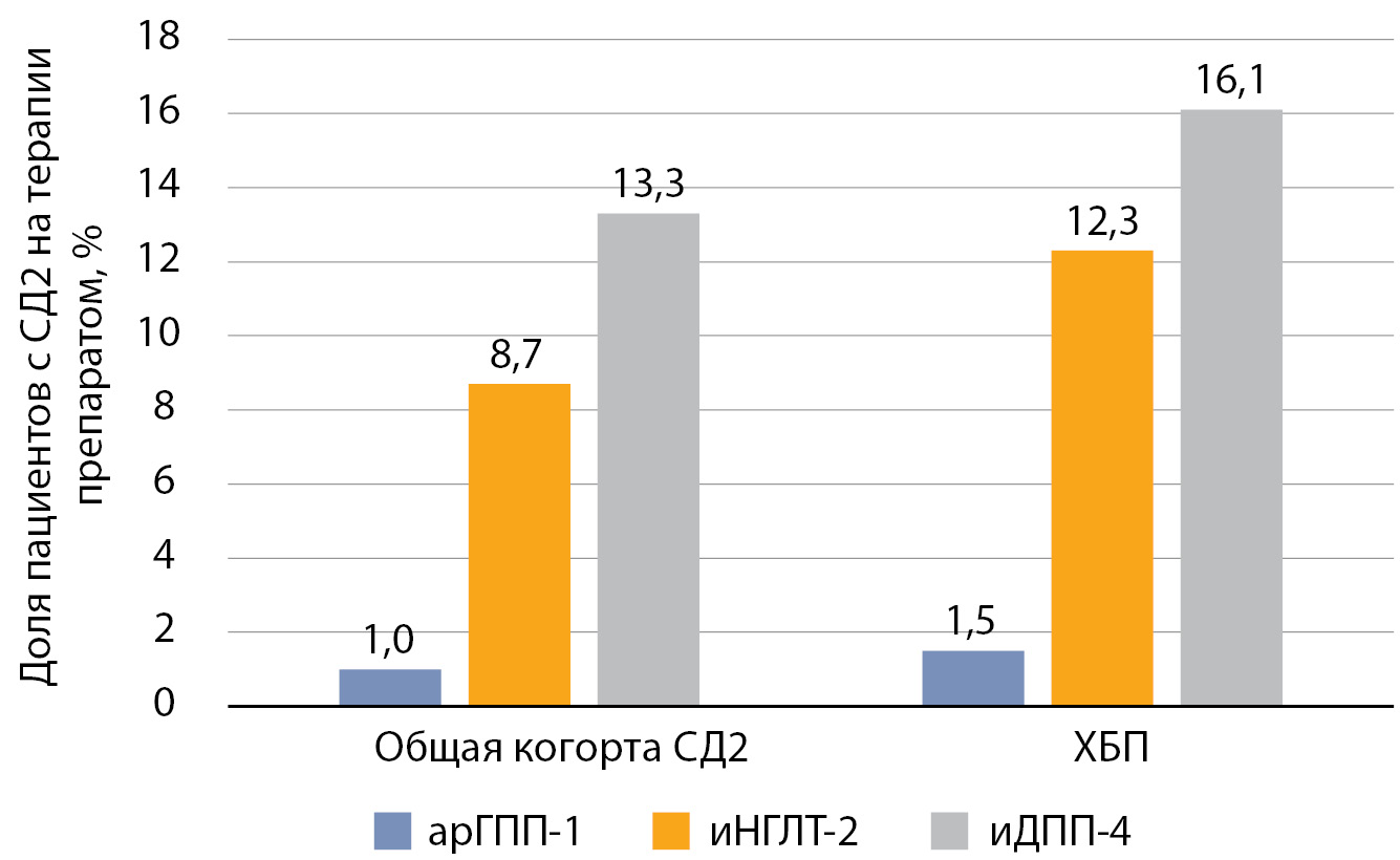 С 2021 г. в «Алгоритмы специализированной медицинской помощи больным с СД» [1] было введено положение относительно применения «болезнь-модифицирующего» подхода при выборе сахароснижающей терапии (ССТ): пациентам с СД2 и ХБП показаны препараты из групп ингибиторов натрий-глюкозного ко-транспортера 2 (иНГЛТ-2) и/или агонистов рецепторов глюкагоноподобного пептида 1 типа (арГПП-1) с подтвержденными преимуществами при этих состояниях с целью улучшения долгосрочного прогноза.