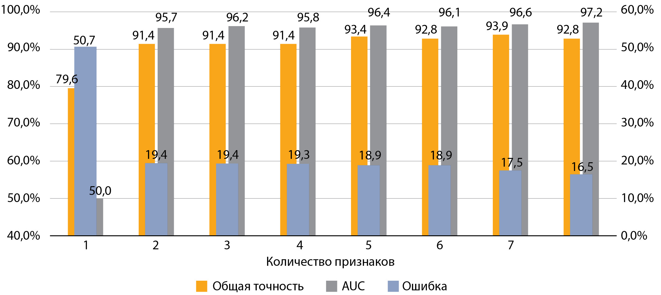 Общая точность и AUC по основной оси, ошибка по вспомогательной оси.