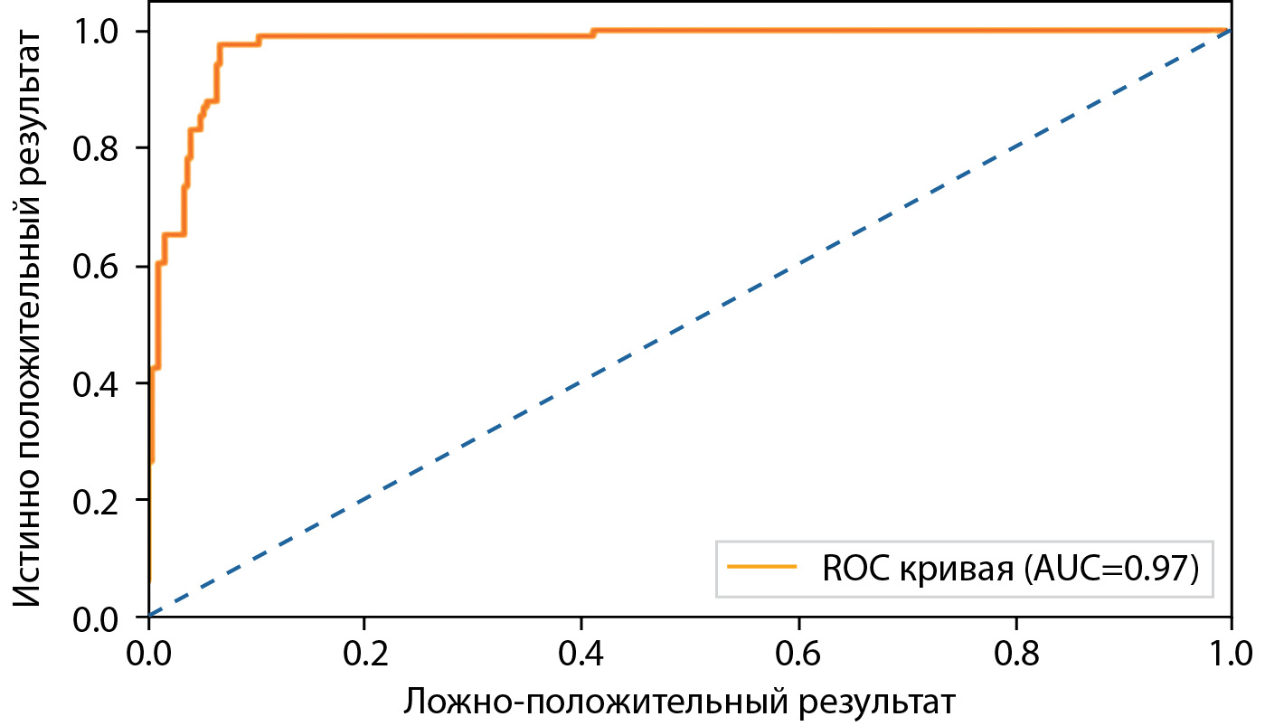 После обучения оценка производительности (качества) НС проводилась на тестовой выборке. В процессе оценки разработанная НС продемонстрировала хорошие прогностические возможности. Так, площадь под ROC (receiver operating characteristics) кривой (AUC) достигла 0,97 (рис. 3).