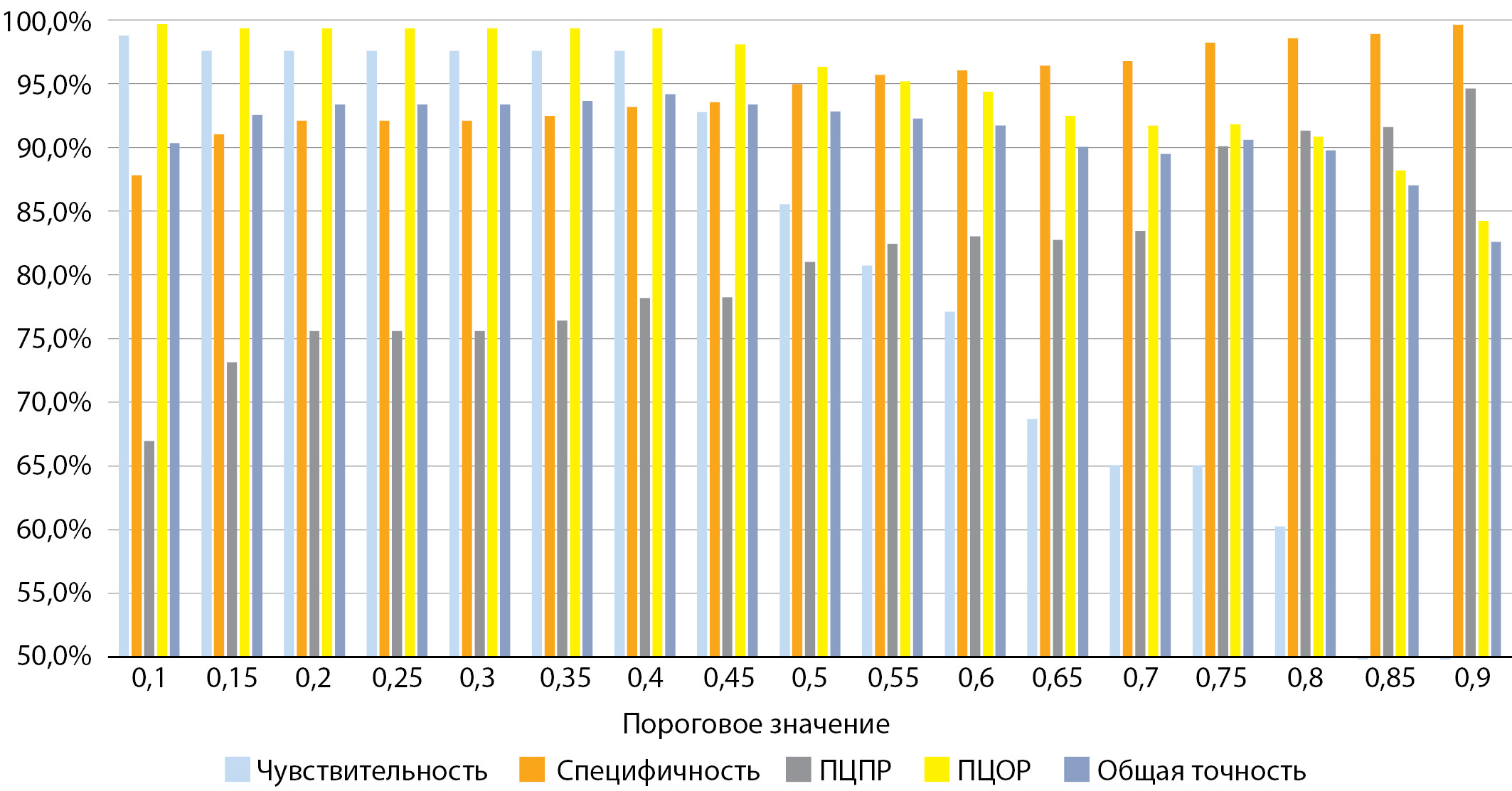 Для определения наиболее оптимального порогового значения предсказанной вероятности MODY диабета были проанализированы различные показатели матрицы несоответствий, отражающие качество НС (рис. 4).