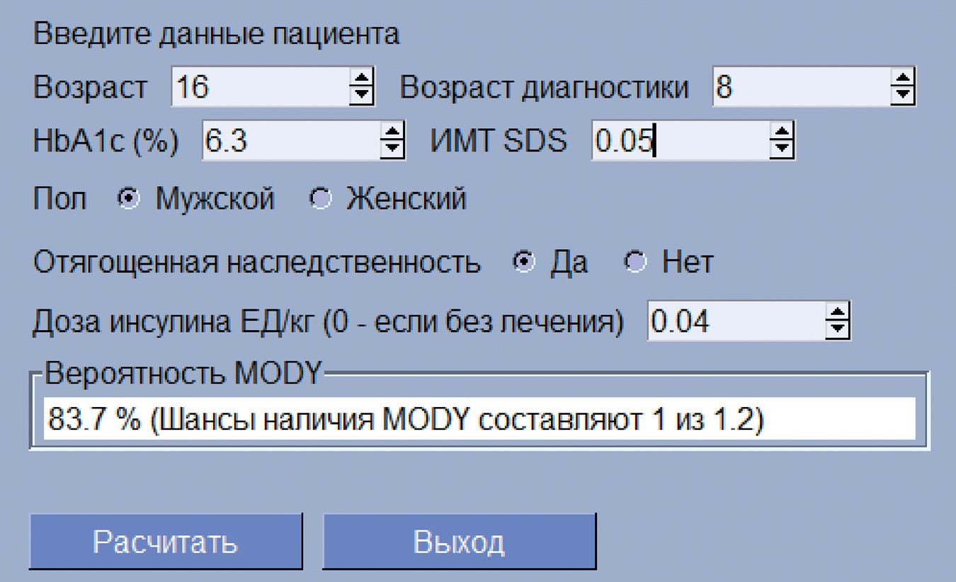 В настоящее время существует единственная модель прогнозирования вероятности MODY, которая предложена B.M. Shields и соавт. в Великобритании в 2012 г. Для ее разработки в исследование были включены пациенты с СД, диагностированным от 1 года до 35 лет: 594 пробанда с MODY (243 GCK, 296 HNF1A, 55 HNF4A), 278 пациентов с СД1, 319 — с СД 2 типа (СД2). Проводилось сравнение клинических характеристик между MODY и СД1, MODY и СД2. Наиболее сильным предиктором MODY при сравнении с СД1 было наличие сахарного диабета у родителей, вероятность MODY выше в 23 раза у тех пациентов, у которых у одного их родителей диагностирован СД, по сравнению с теми, у кого родители были без нарушений углеводного обмена. Другими предикторами MODY были более низкий уровень HbA1c, женский пол, более старший возраст диагностики диабета [5]. Практическое внедрение модели прогнозирования вероятности MODY в Великобритании в течение 10 лет позволило в 4 раза увеличить количество пациентов, направленных на молекулярно-генетическое исследование, а также повысить долю выявления патогенных вариантов в генах, ответственных за развитие MODY с 25 до 33% [9].