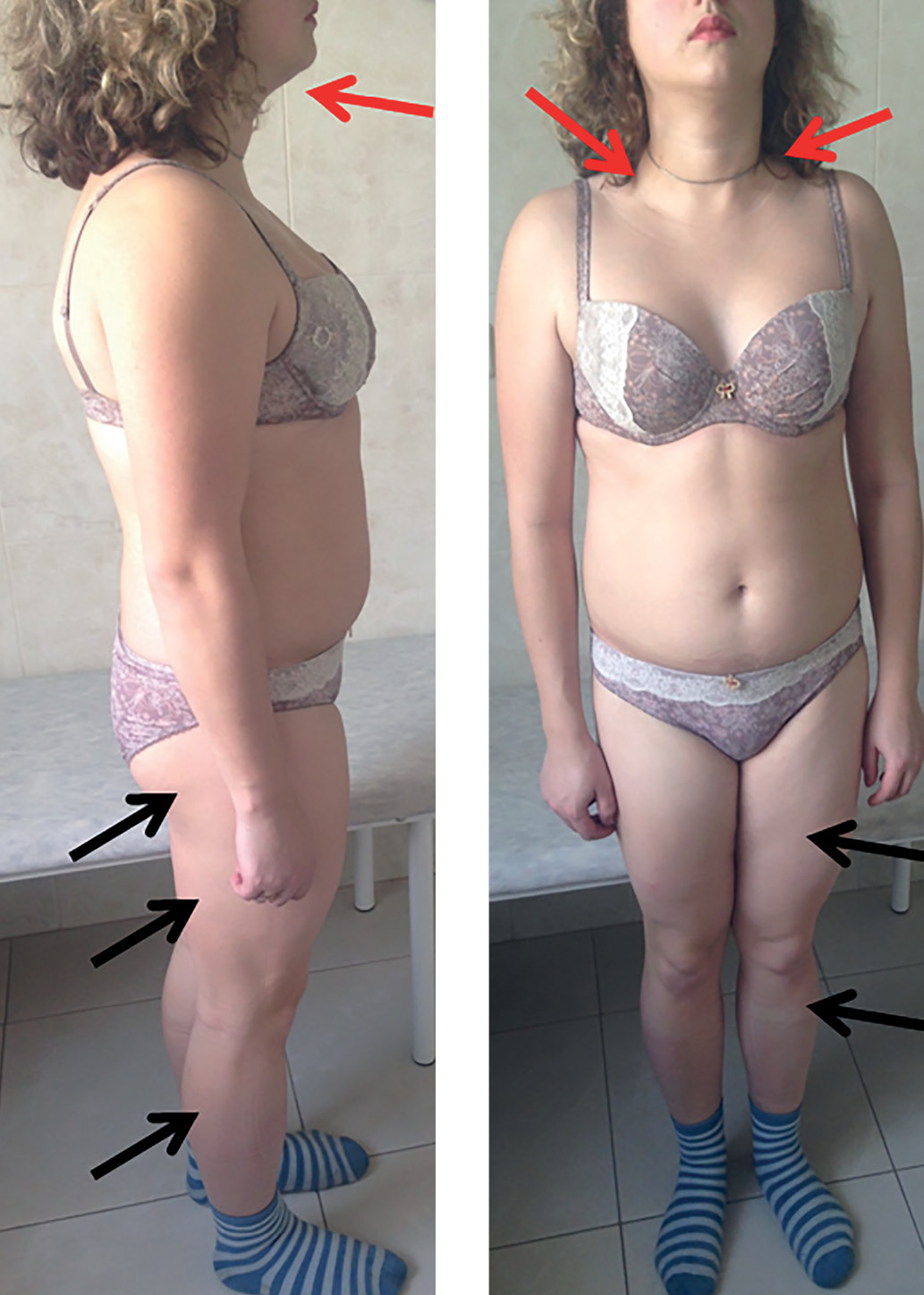 5. Рисунок 5. Фенотип пациентки Д. Красной стрелкой обозначены зоны липогипертрофии; черной — зоны липодистрофии. | |