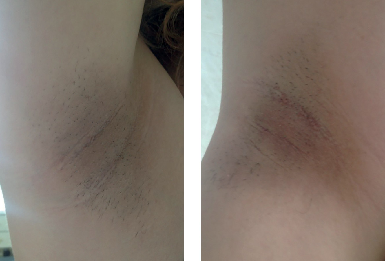 Рисунок 2. Acanthosis nigricans подмышечных впадин пациентки К. (впервые опубликовано Соркина Е.Л. и соавт.) [8].