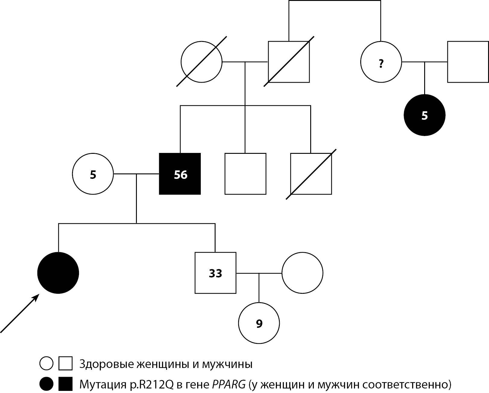 В ФГБУ ЭНЦ проведен молекулярно-генетический анализ. В гене PPARG (NM_001374266.1) был выявлен вариант нуклеотидной последовательности c.635G>A в гетерозиготном положении, приводящий к миссенс-замене p.Arg212Gln. Аналогичный вариант был выявлен у отца пациентки и его двоюродной сестры (рис. 3). Изначально этот вариант расценивался как вариант неопределенного клинического значения, однако результаты сегрегационного анализа позволяют перевести его в вероятно-патогенный (критерии PM2, PM5, PP2, PP1, PP4) согласно рекомендациям Американского колледжа медицинской генетики и геномики (ACMG) от 2015 г. и руководству по интерпретации данных массового параллельного секвенирования [9].