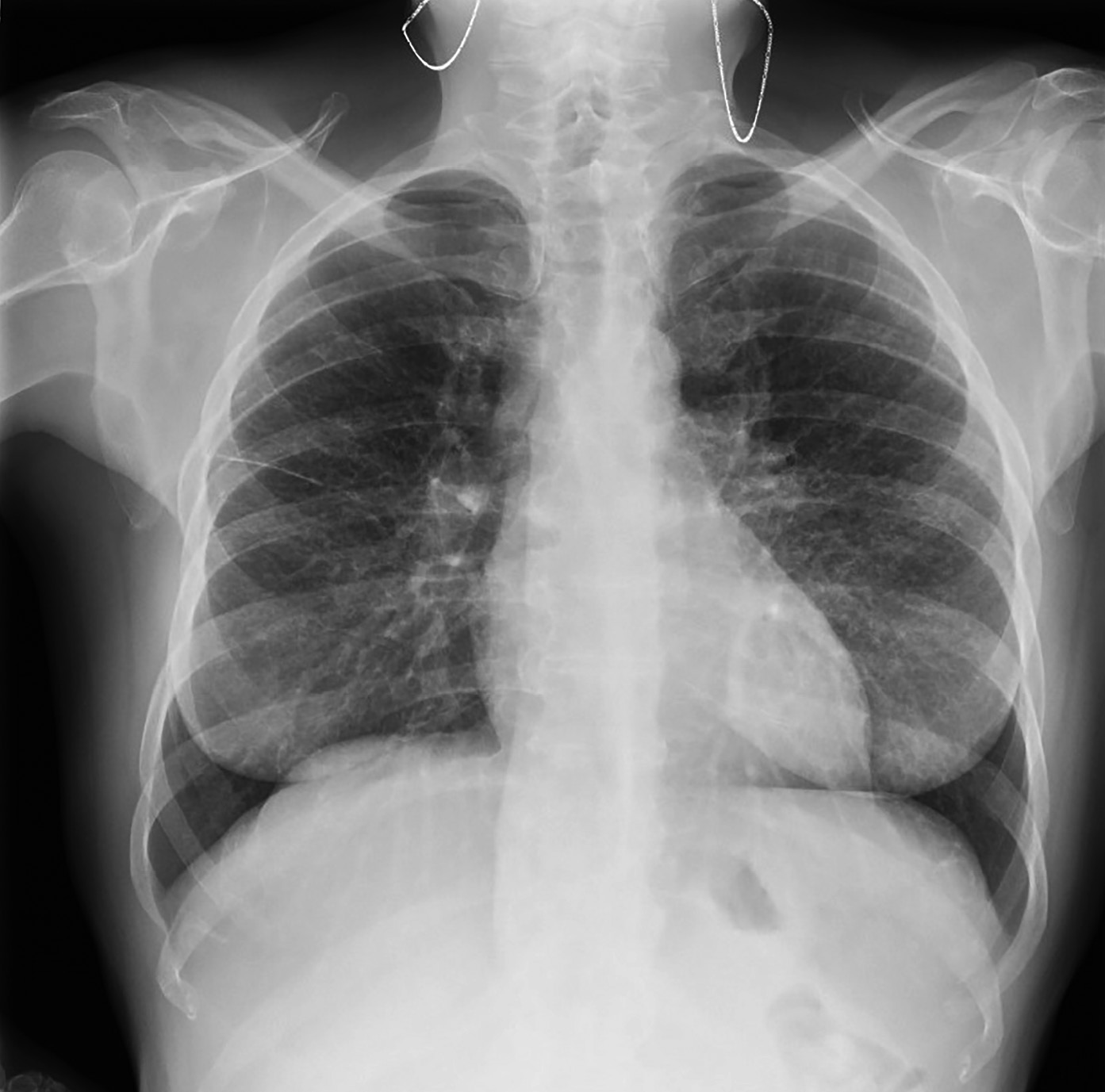 В 2017 г. (в 45 лет) при обследовании по поводу длительно непроходящего кашля выявлен саркоидоз легких и внутригрудных лимфатических узлов. По данным рентгенографии легких от 08.2023 г. (рис. 4), легкие умеренно эмфизематозны, корни расширены, фиброзны, бронхолегочный рисунок деформирован, усилен по интерстициально-сосудистому типу, имеется увеличение внутригрудных лимфатических узлов. Междолевая шварта справа. Со слов пациентки, она была консультирована пульмонологом, морфологическая верификация диагноза не требуется.
