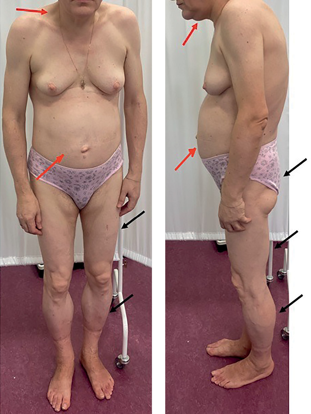 Рисунок 1. Фенотип пациентки К. Красной стрелкой обозначены зоны липогипертрофии; черной — зоны липодистрофии (впервые опубликовано Соркина Е.Л. и соавт.) [8].