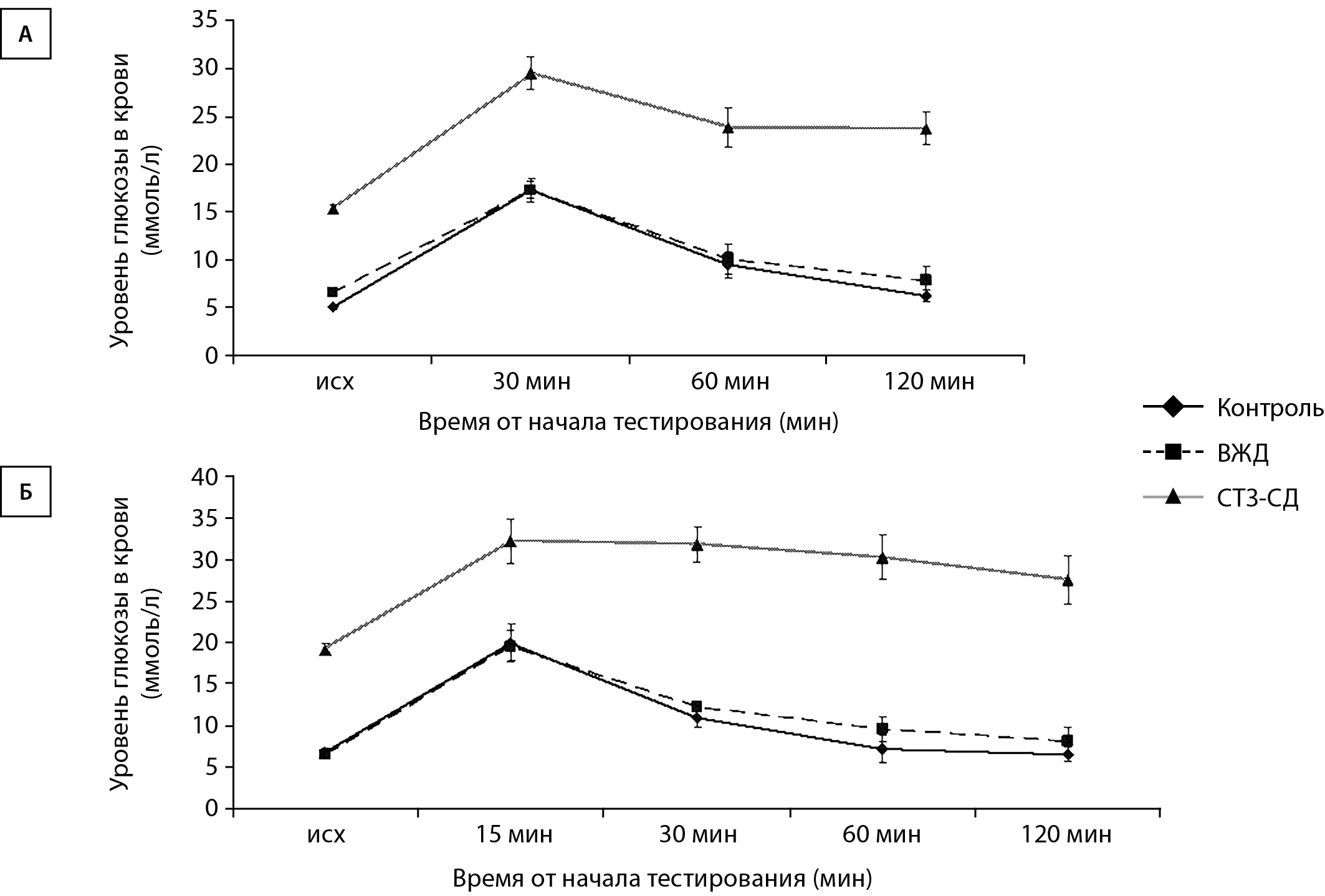 Примечание. ВЖД — высокожировая диета; СТЗ-СД — стрептозотоциновый сахарный диабет. По горизонтали — время от начала тестирования (мин), по вертикали — уровень глюкозы в крови (ммоль/л). Данные представлены в виде среднего арифметического±ошибка среднего.