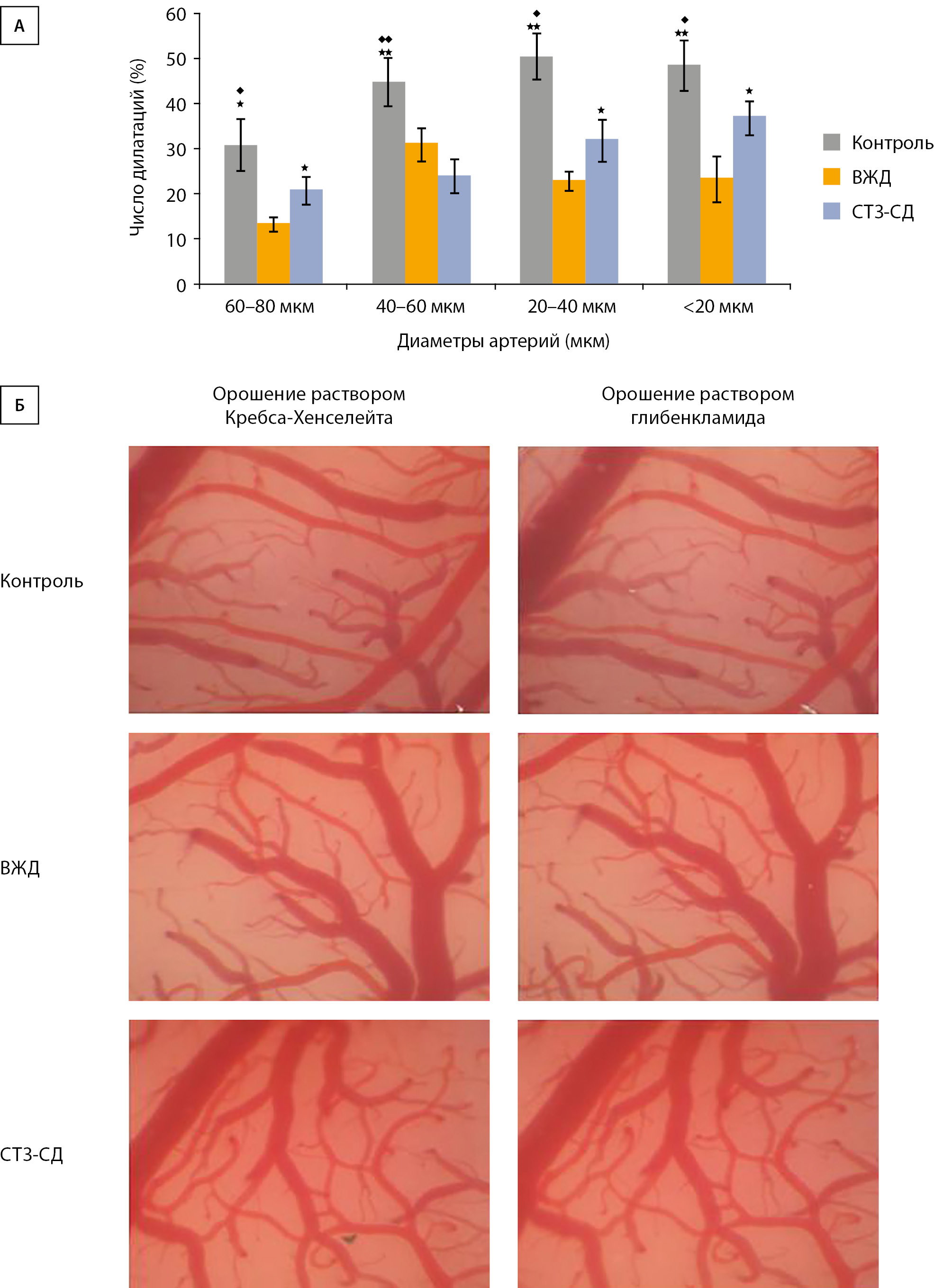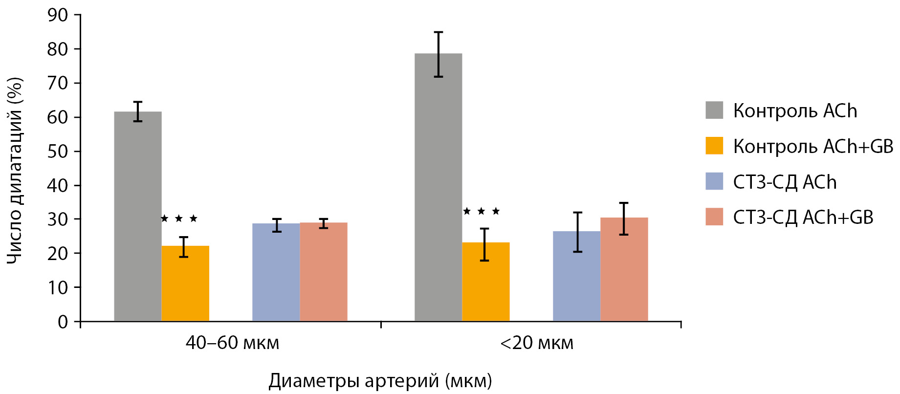 RESULTS: With modeling STZ-T2DM, rats developed glucose tolerance and insulin resistance. Compared to control animals, body weight was 1,3 times higher, the percentage of visceral fat was 3 times higher, and the blood glucose level was 3,2 times higher. It was shown that in STZ-T2DM the number of pial artery constrictions under the action of glibenclamide decreased by 1,3 — 1,9 times compared to intact rats. Glibenclamide did not block endothelium-dependent dilation.