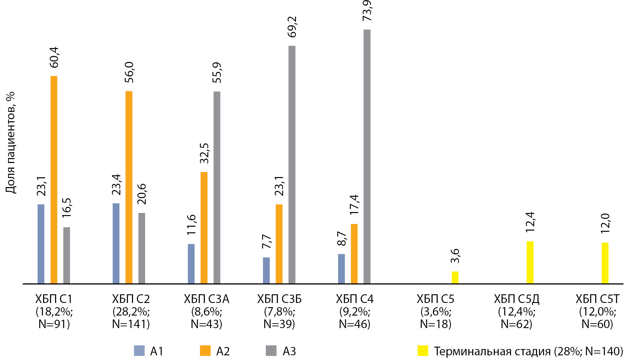 Анализ состояния ССЗ выявил достаточно высокую распространенность артериальной гипертензии (АГ) — 82,3%. АГ III стадии регистрировалась у 57,8% по отношению к общему числу больных, АГ II стадии — у трети больных (30,5%) и АГ I стадии — всего у 9,0% пациентов от общего числа лиц, включенных в исследование. Медиана длительности АГ составила 10 лет [ 3; 15]. Ожидаемо была получена высокая распространенность гипертрофии миокарда левого желудочка — у 60,4%, при этом концентрическая гипертрофия регистрировалась у 28,2%, у 15,2% — эксцентрическая гипертрофия, и у 17,0% — концентрическое ремоделирование. На рис. 8 изображено распределение пациентов с АГ в соответствии с почечной дисфункцией. Хроническую сердечную недостаточность (ХСН) имели 16,5% пациентов, а нарушения сердечного ритма диагностировались у 3,0% среди лиц, включенных в исследование.