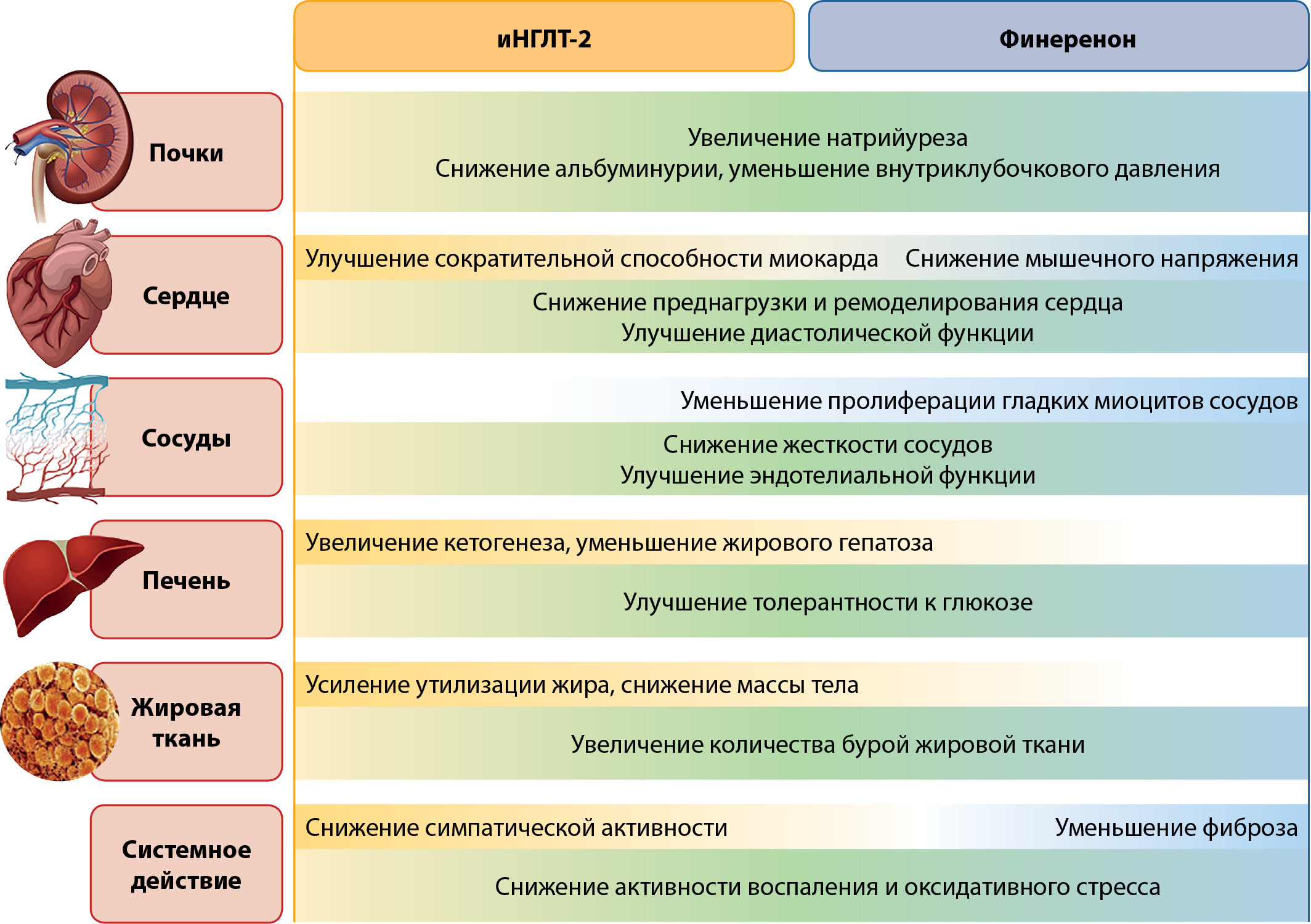 3. Рисунок 3. Эффекты терапии финереноном и ингибиторами натрий-глюкозных ко-транспортеров 2 типа в доклинических испытаниях. Адаптировано из [25]. | |