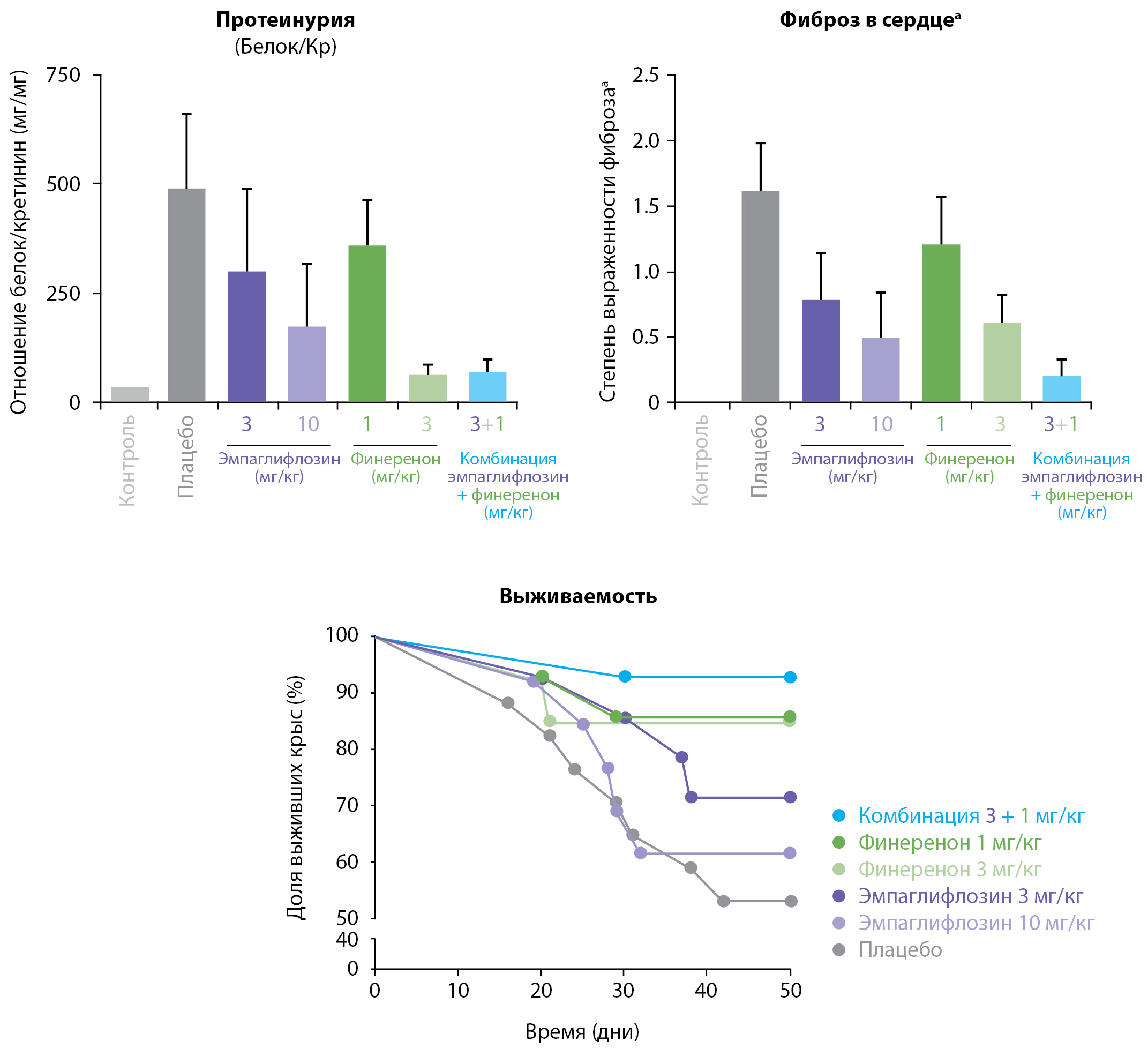 Впервые преимущество совместного применения финеренона и иНГЛТ-2 по сравнению с монотерапией было продемонстрировано в доклинических исследованиях. В экспериментальной работе Kolkhof P. на крысах была смоделирована типичная картина развития и прогрессирования артериальной гипертензии и эндотелиальной дисфункции с последующим повреждением органов-мишеней (включая гипертрофию левого желудочка сердца и гломерулосклероз). Все животные получали иАПФ (каптоприл). Далее крыс разделили на группы: плацебо, получавших эмпаглифлозин (3 и 10 мг/кг), финеренон (1 и 3 мг/кг) и комбинированную терапию (эмпаглифлозин 3 мг/кг + финеренон 1 мг/кг). Помимо смертности, у животных оценивали АД, выраженность протеинурии, уровень креатинина и мочевой кислоты плазмы, выраженность фибротических процессов в сердечно-сосудистой системе и почках. Согласно результатам, дозозависимый кардио- и нефропротективный эффект был выявлен и у финеренона, и у эмпаглифлозина, однако у их комбинации по сравнению с монотерапией был более выраженный эффект (рис. 3) [25]. Несмотря на то, что данные результаты были получены в доклинических условиях и еще не были подтверждены в крупных многоцентровых исследованиях на людях, они стали первым доказательством синергического действия финеренона и эмпаглифлозина.