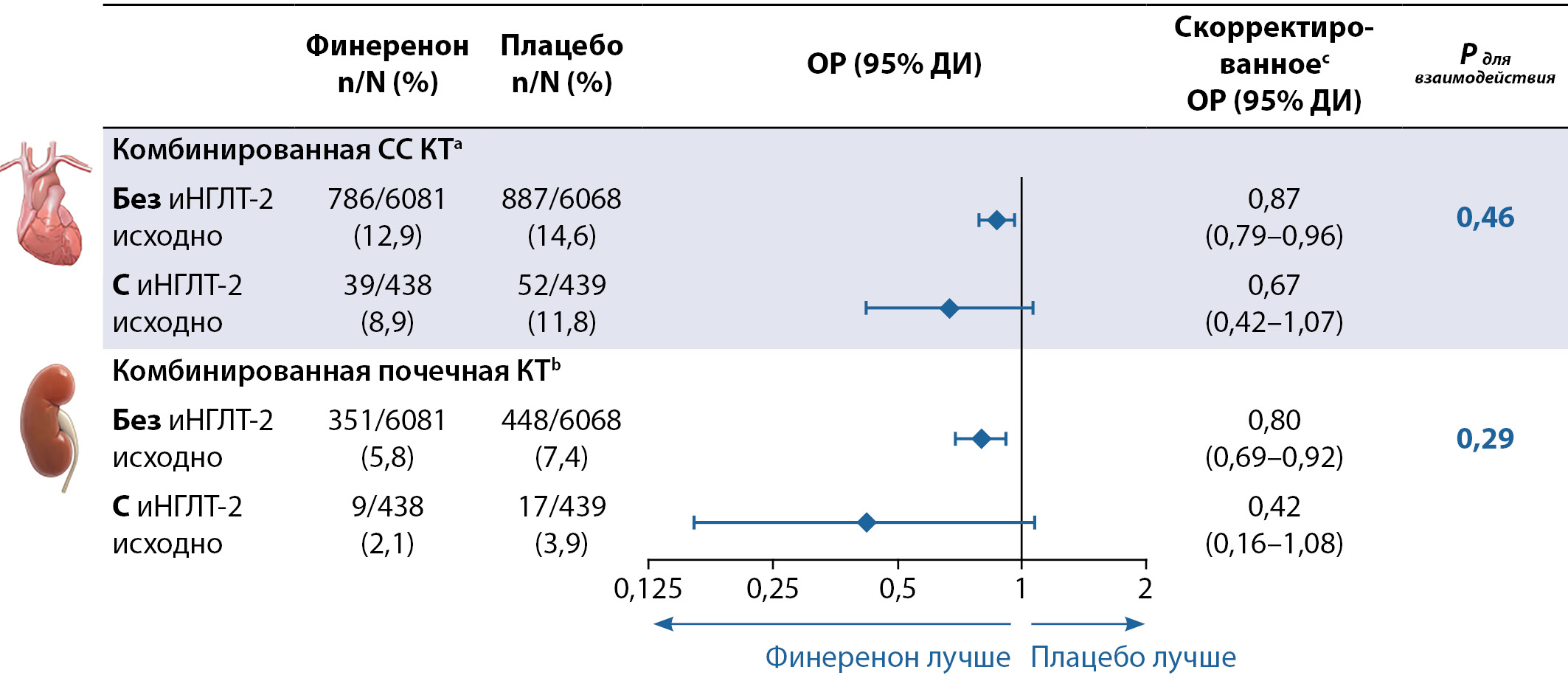 4. Рисунок 4. Кардионефропротективный эффект финеренона в зависимости от исходной терапии ингибиторами натрий-глюкозных ко-транспортеров 2 типа. Адаптировано из [26]. | |