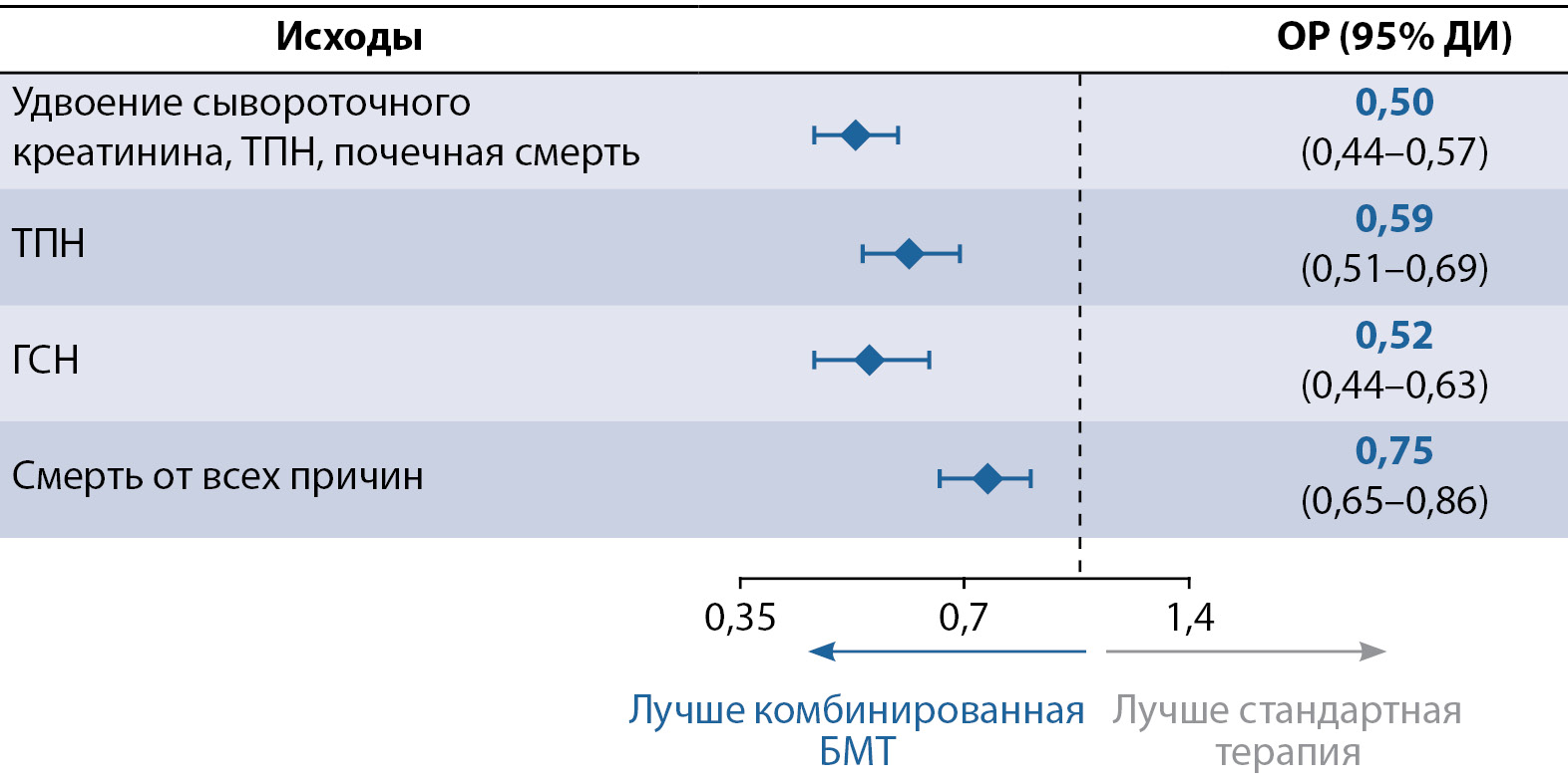 5. Рисунок 5. Эффекты комбинированной болезнь-модифицирующей терапии хронической болезни почек (ингибиторы натрий-глюкозных ко-транспортеров 2 типа+финеренон+ингибиторы ангиотензин-превращающего фермента (иАПФ) или блокаторы рецепторов к ангиотензину II) по сравнению со стандартной терапией ингибиторами ангиотензин-превращающего фермента (иАПФ) или блокаторами рецепторов к ангиотензину II по ключевым конечным точкам. Адаптировано из [28]. | |