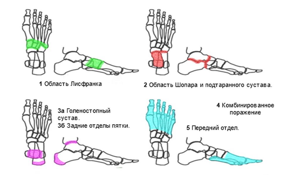 Классификации диабетической нейроостеоартропатии на основе локализации поражения