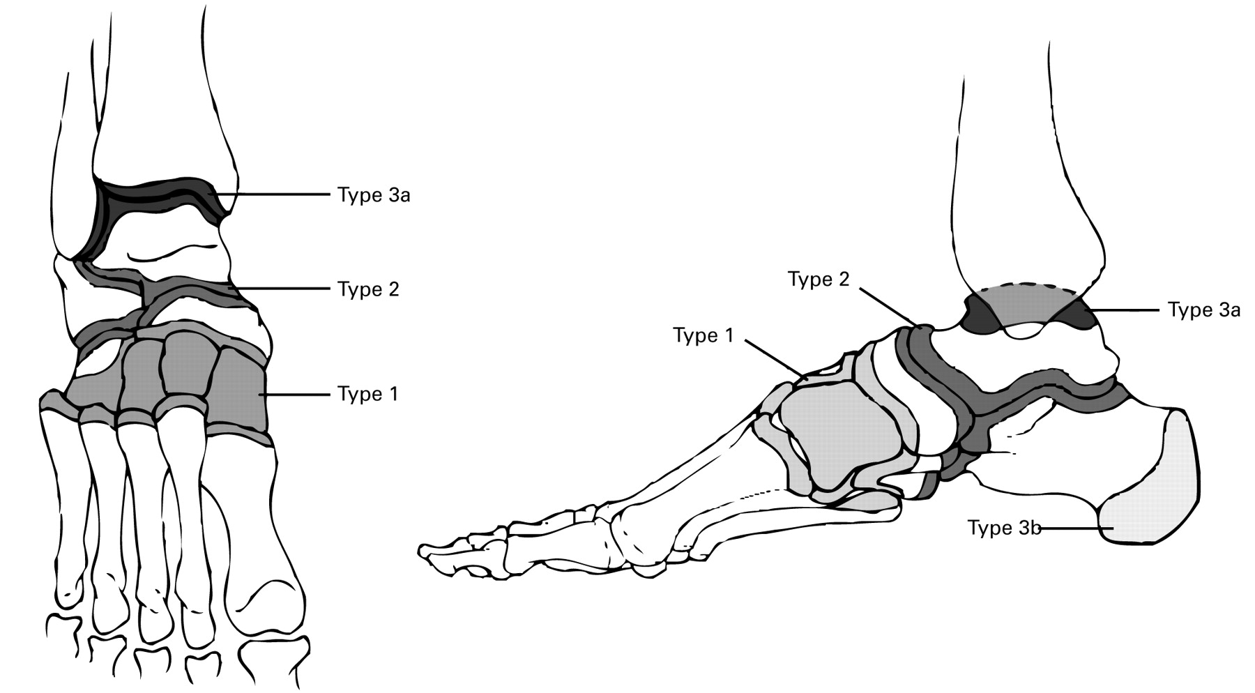 По его данным, 70% поражений составили сустав Лисфранка и ладьевидно-клиновидные суставы (тип 1). Этот вариант поражения сопровождался наибольшей частотой язвообразования, но реже требовал хирургической стабилизации. Тип 2 отмечался в 20% случаев и характеризовался поражениями, вовлекающими в разных комбинациях сустав Шопара, подтаранный, пяточно-кубовидный суставы. Тип 3 вовлекает голеностопный сустав (вариант 3а) и пяточную кость в области бугра (вариант 3в) и встречался автору редко — около 10% случаев. Второй и третий типы характеризовались автором как наиболее часто сопровождающиеся нестабильностью варианты патологии и, следовательно, требующие, с высокой вероятностью, хирургического лечения [8].