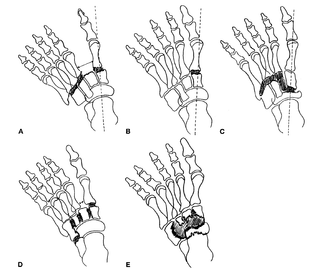 По мнению этих авторов, при типе 1 изменения затрагивают сустав Лисфранка, возникает диастаз между I и II плюсневыми костями с последующей дислокацией переднего отдела стопы латерально и к тылу, при этом I плюсневая кость либо остается в прежнем положении, либо смещается несколько латеральнее относительно оси, проходящей через шейку таранной кости. Второй тип поражения характеризуется изолированной деструкцией первого плюсне-клиновидного сустава. Третий тип описывает изменения, возникающие в ладьевидно-клиновидном суставе: деструкцию промежуточной клиновидной кости и последующим распространением патологического процесса на весь сустав Лисфранка. Четвертый тип включает в себя поражение первого плюсне-клиновидного сустава с развитием диастаза не только между I и II плюсневыми костями, но и в межклиновидных суставах с распространением изменений на плюсне-кубовидный сустав. При пятом типе поражается ладьевидная кость и окружающие ее кости с последующей деструкцией клиновидных и кубовидной костей и поражением сустава Шопара.