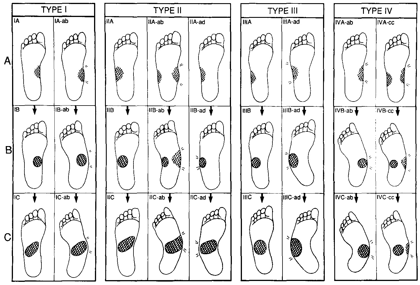Первой (и пока единственной) попыткой создать всеобъемлющую классификацию ДНОАП среднего отдела, объединяющую рентгенологическую картину с характером деформаций, была работа L. Shon и соавт., опубликованная в 1998 г. [11]. Авторами были проанализированы рентгенограммы и характер деформаций 131 стопы у 109 пациентов, из которых 86 страдали СД. Авторы выделили четыре типа поражения среднего отдела стопы. Каждый из типов подразделяется на три стадии в зависимости от степени тяжести деформации продольных сводов стопы: легкой (деформация с частичным сохранением свода, стадия А), умеренной (коллапс свода, стадия В), и тяжелой (пролабирование костных структур с формированием стопы-качалки, стадия С). Кроме того, каждый из типов поражения среднего отдела делится на два варианта: первый — преимущественное поражение медиального и центрального сводов, второй — преимущественное поражение латерального свода. Таким образом, с учетом всех комбинаций, было описано 27 вариантов поражения (рис. 5).