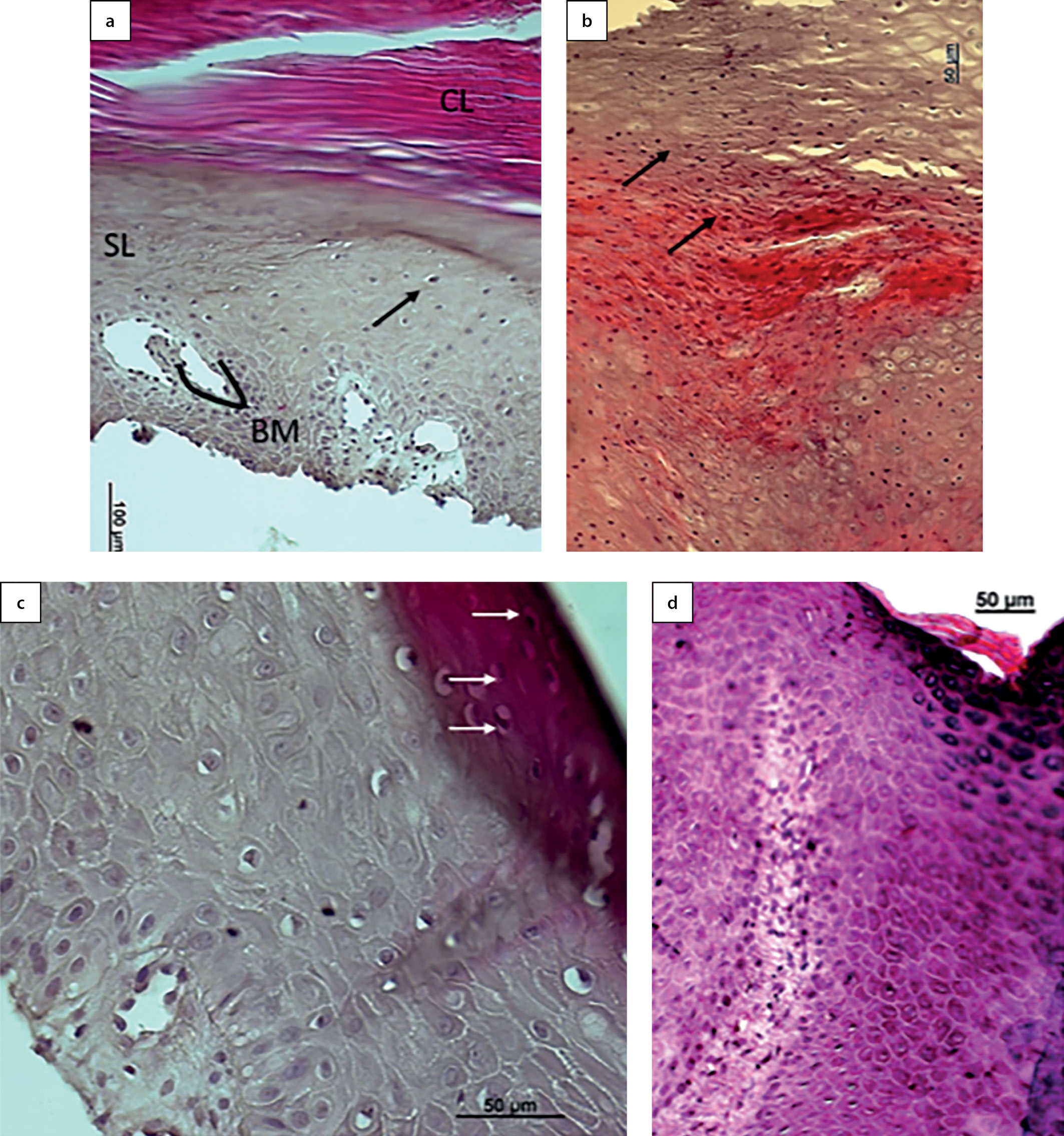 2. Рисунок 2. Гистологическая картина кожи пациента с нейропатической раной стопы (а, b, c) и участки пролежня пояснично-крестцового отдела (d). Окраска. Стрелками указаны митотически активные клетки.