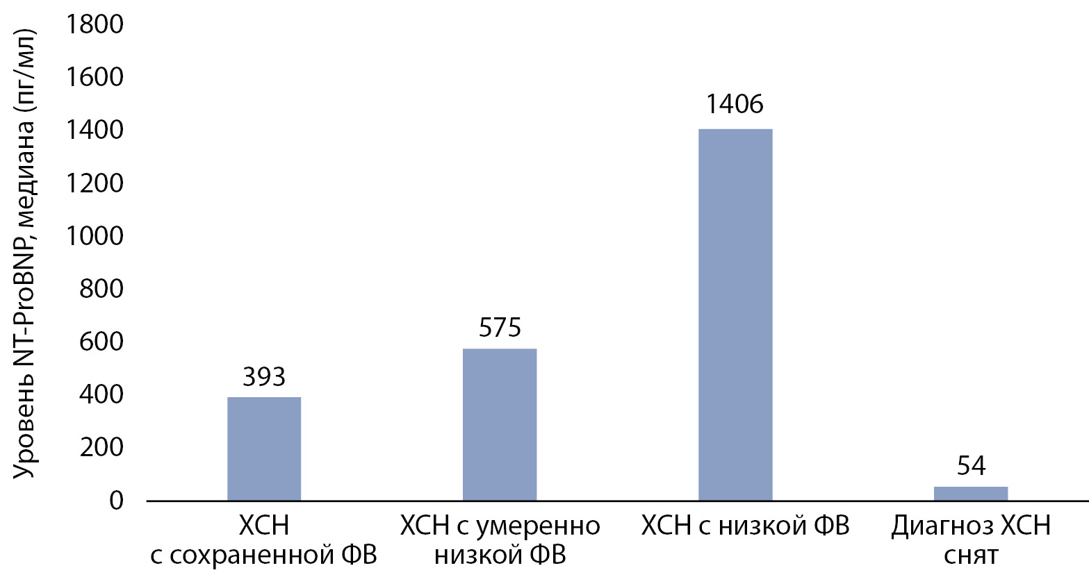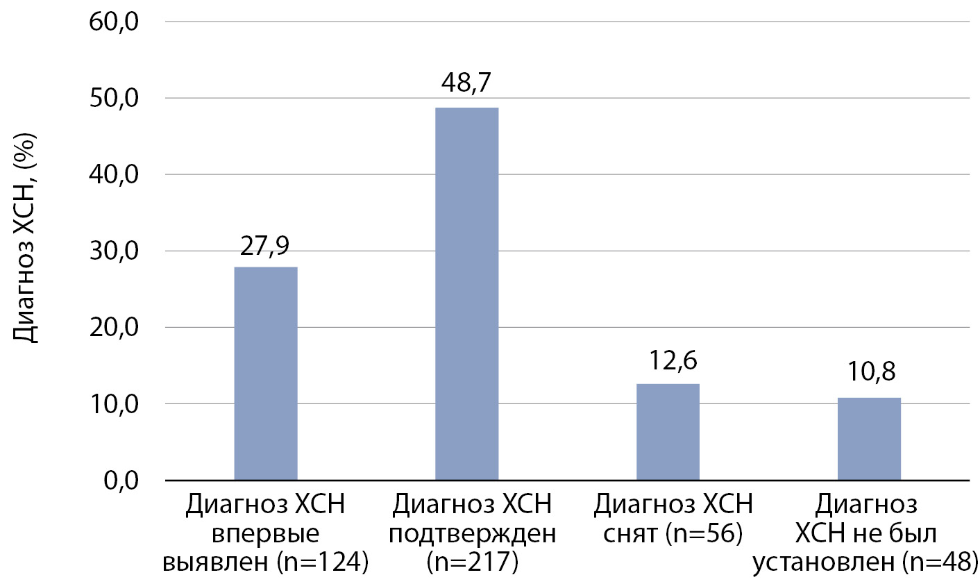 При наличии СН с сохранной ФВ проводилась оценка морфо-функциональных параметров сердца с оценкой наличия диастолической дисфункции и уровня биомаркера NT-proBNP. При нормальных морфо-функциональных показателях сердца, отсутствии диастолической дисфункции и NT-proBNP<125 пг/мл диагноз СН с сохранной ФВ считался маловероятным и был снят. Решение вопроса о снятии диагноза СН принималось совместно с кардиологом.