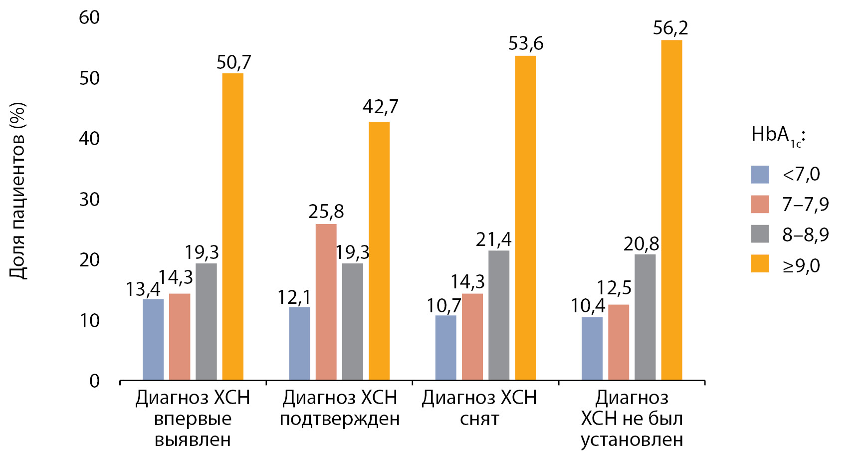 3. Рисунок 3. Доля пациентов с разными уровнями HbA1c по подгруппам в зависимости от диагноза хронической сердечной недостаточности.