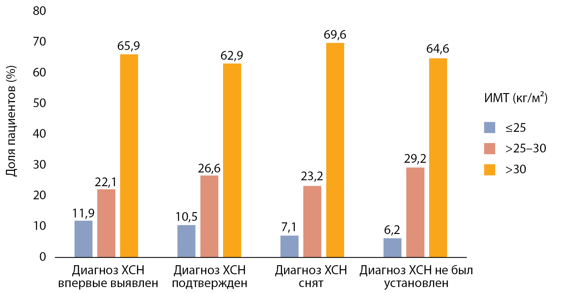 4. Рисунок 4. Доля пациентов с разными значениями индекса массы тела по подгруппам в зависимости диагноза хронической сердечной недостаточности.