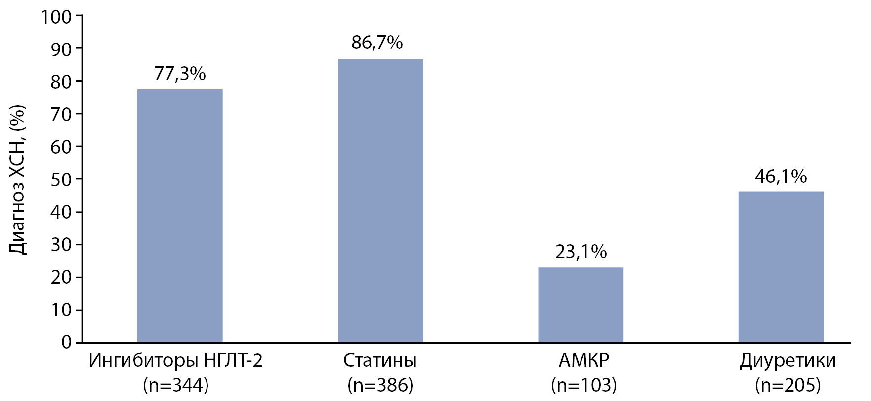 РЕЗУЛЬТАТЫ. В исследование было включено 445 пациентов в соответствии с основными критериями включения: СД2, возраст старше 50 лет, длительность СД2 более 3 лет. Частота СН у пациентов с СД2 при выписке составила 76,6%. Из них диагноз СН был подтвержден в 48,7% случаев (n=217), впервые выявленная СН встречалась в 27,9% случаев (n=124) случаев, у 12,6% пациентов (n=56) диагноз СН был снят, в 10,8% (n=48) случаев диагноз СН не был установлен. Частота назначения препаратов при выписке составила: ингибиторы натрий-глюкозного котранспортера 2-го типа — 77,3% (n=344), статины — 86,7% (n=386), антагонисты минералокортикоидных рецепторов — 23,1% (n=103), диуретики — 46,1% (n=205).