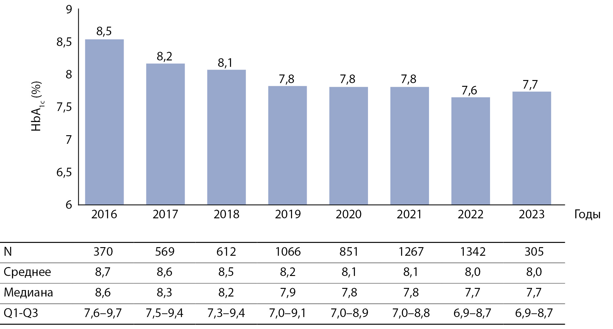 Рисунок 1. Показатели гликированного гемоглобина (HbA1c) по годам в период 2016–2023 гг. Данные на графике представлены в виде медиан. Для сравнения HbA1c в разные годы использован критерий χ²: χ²=79, p<0,001. Показатели HbA1c скорректированы с поправкой на возраст и длительность сахарного диабета 1 типа.