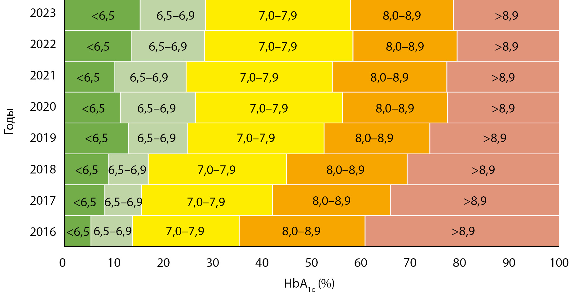 Рисунок 2. Распределение показателей гликированного гемоглобина (HbA1c) по различным диапазонам в период 2016–2023 гг. Показатели HbA1c скорректированы с поправкой на возраст и длительность сахарного диабета 1 типа.