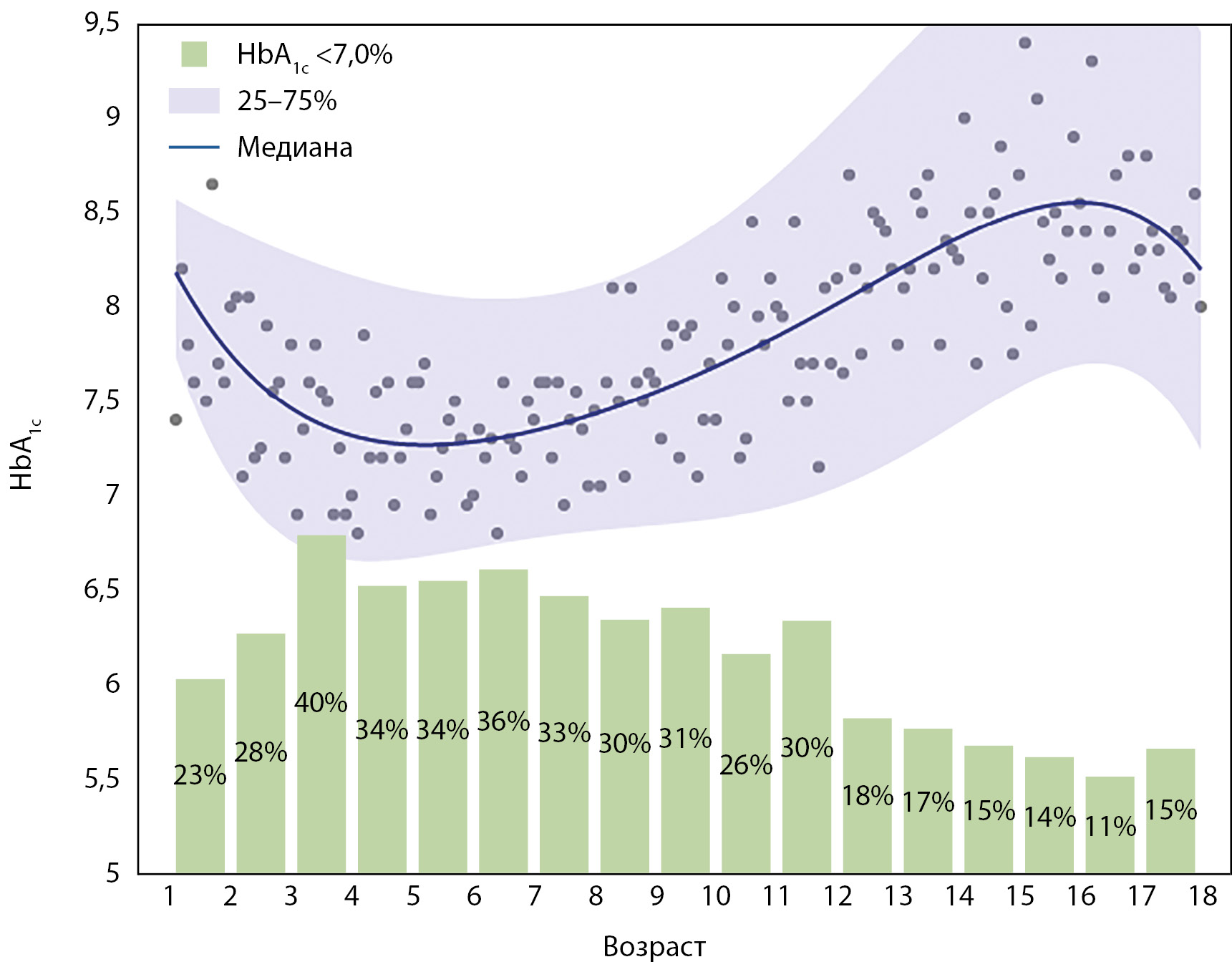 Рисунок 5. Показатели HbA1c (синяя линия и диапазон: медиана и 25–75% перцентиль) и доля пациентов с HbA1c<7,0% (зеленые столбцы) в зависимости от возраста участников.