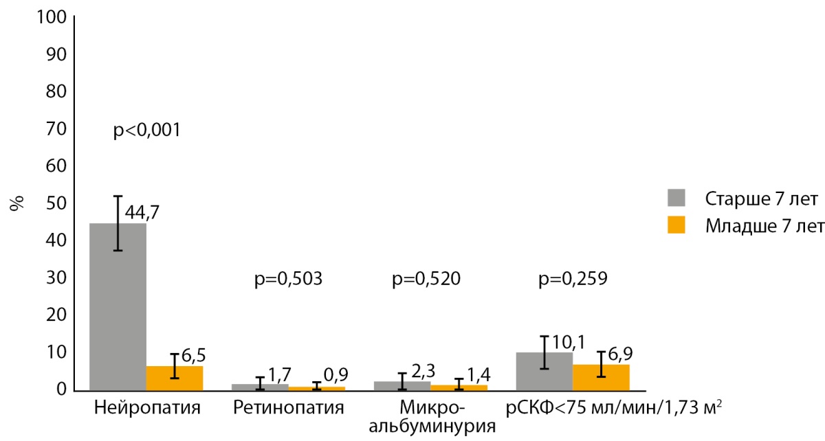 1. Рисунок 1. Частота осложнений у детей в зависимости от возраста манифестации сахарного диабета 1 типа.
