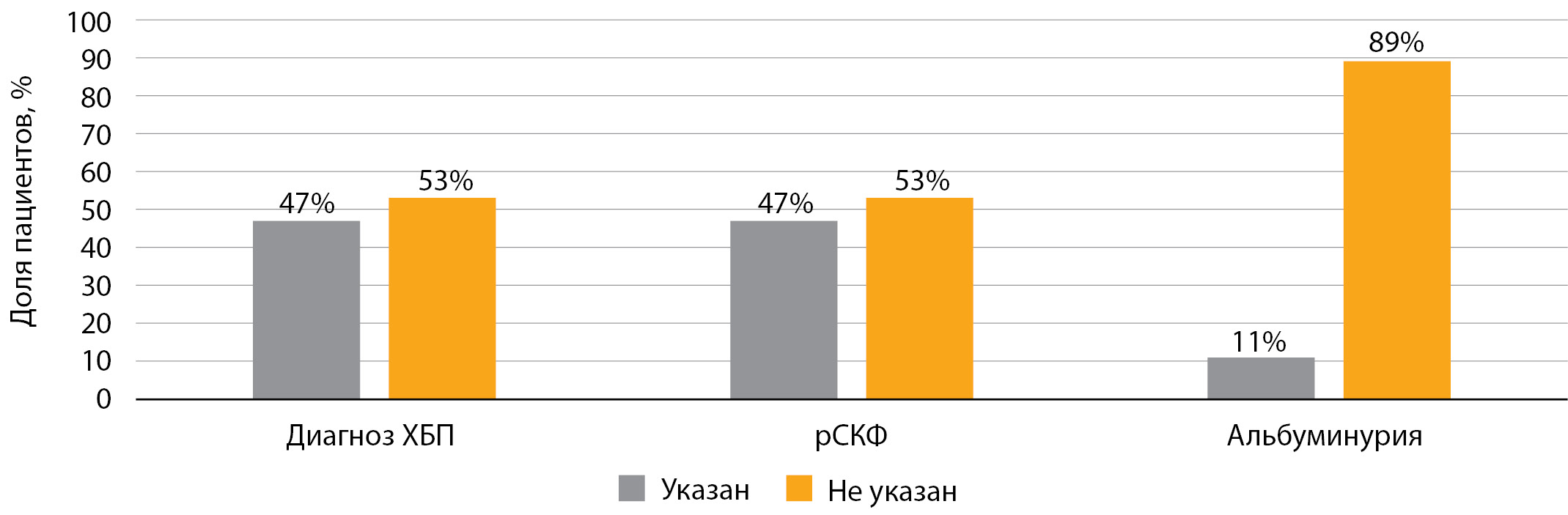 Правильно выставленный диагноз в амбулаторной карте пациента представляет собой важный шаг к лечению и имеет решающее значение для информирования врачей других специальностей, принимающих участие в ведении данного пациента, позволяя адаптировать процесс принятия решений в выборе методов обследования и лечения [27]. С другой стороны, знание о своем диагнозе повышает медицинскую грамотность самого пациента, подчеркивая важность изменения образа жизни, что часто является основой в управлении заболеванием на ранних стадиях ХБП [28][29]. Верификация диагноза также может служить основой для распределения имеющихся ресурсов [29][30].