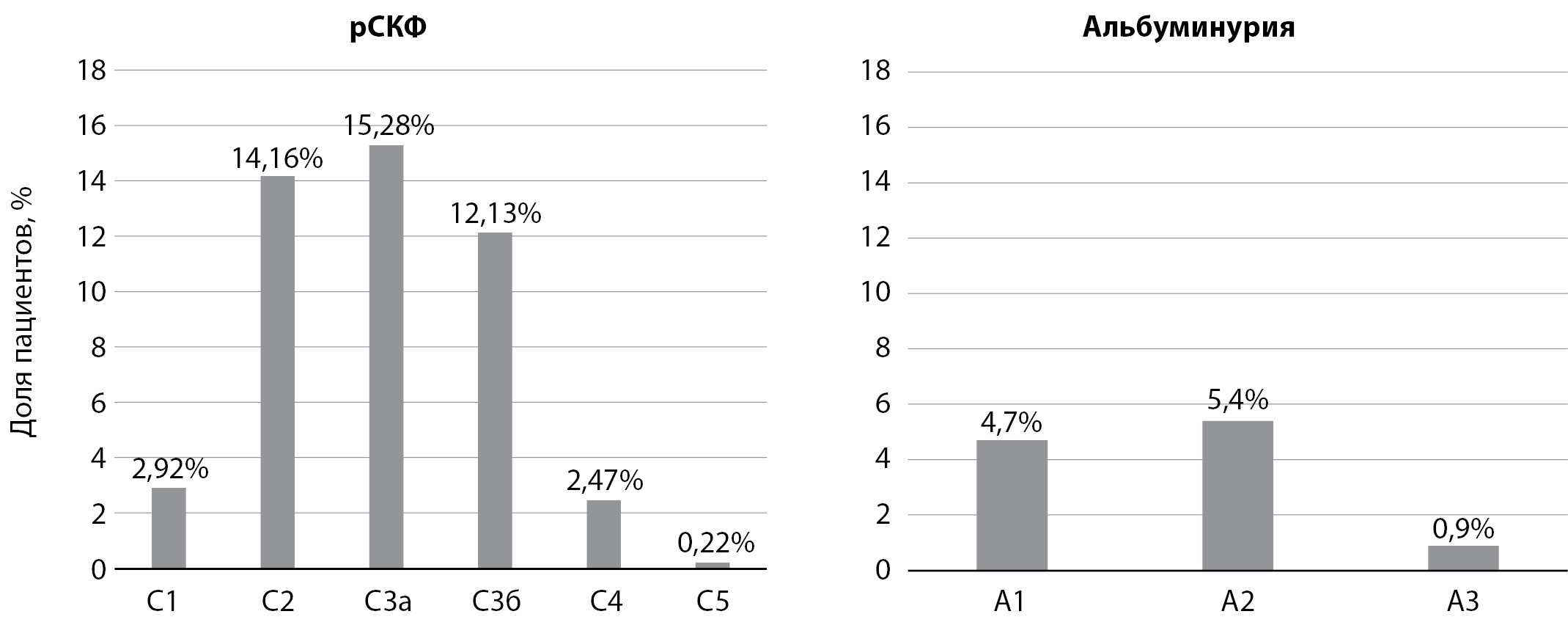 Было проанализировано соответствие данных в имеющейся у пациентов медицинской документации текущему статусу заболевания. Оказалось, что распространенность ХБП составила 90%, при этом у 43% диагноз ХБП был подтвержден, у 40% впервые выявлен, у 7% наблюдалось прогрессирование заболевания. Прогрессирование ХБП определялось как резкое снижение функции почек по сравнению с последними значениями креатинина в сыворотке крови (рис. 3). Наиболее часто выявлялись пациенты со стадией С2 и С3 (а и б), а также с уровнями альбуминурии А1 и А2. Процент пациентов, у которых исследование альбуминурии выполнено не было, оставался высоким — 46,2% (рис. 4).