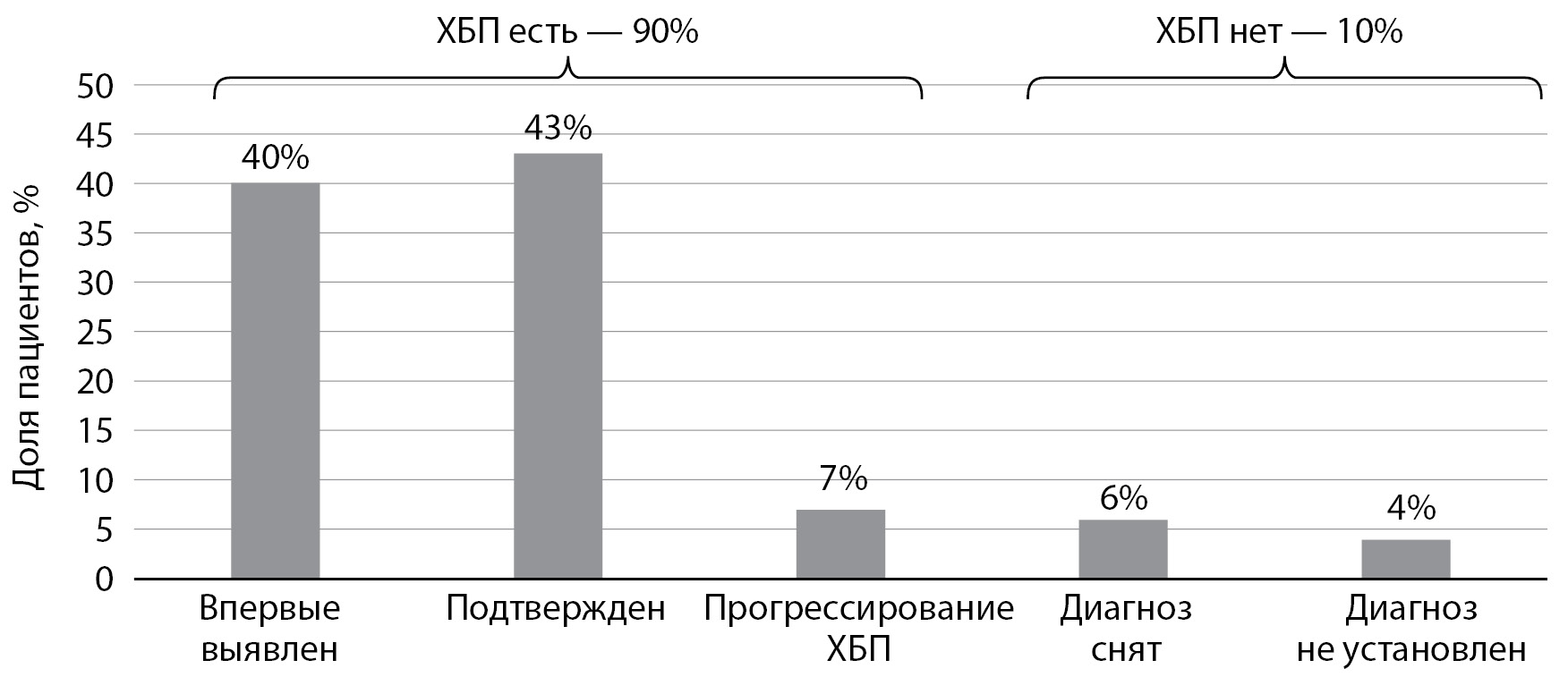 Вторичные конечные точки: доля лиц с недиагностированным диагнозом ХБП, с подтвержденным и со снятым диагнозом ХБП, а также описание клинико-демографических характеристик пациентов и профиля терапии.